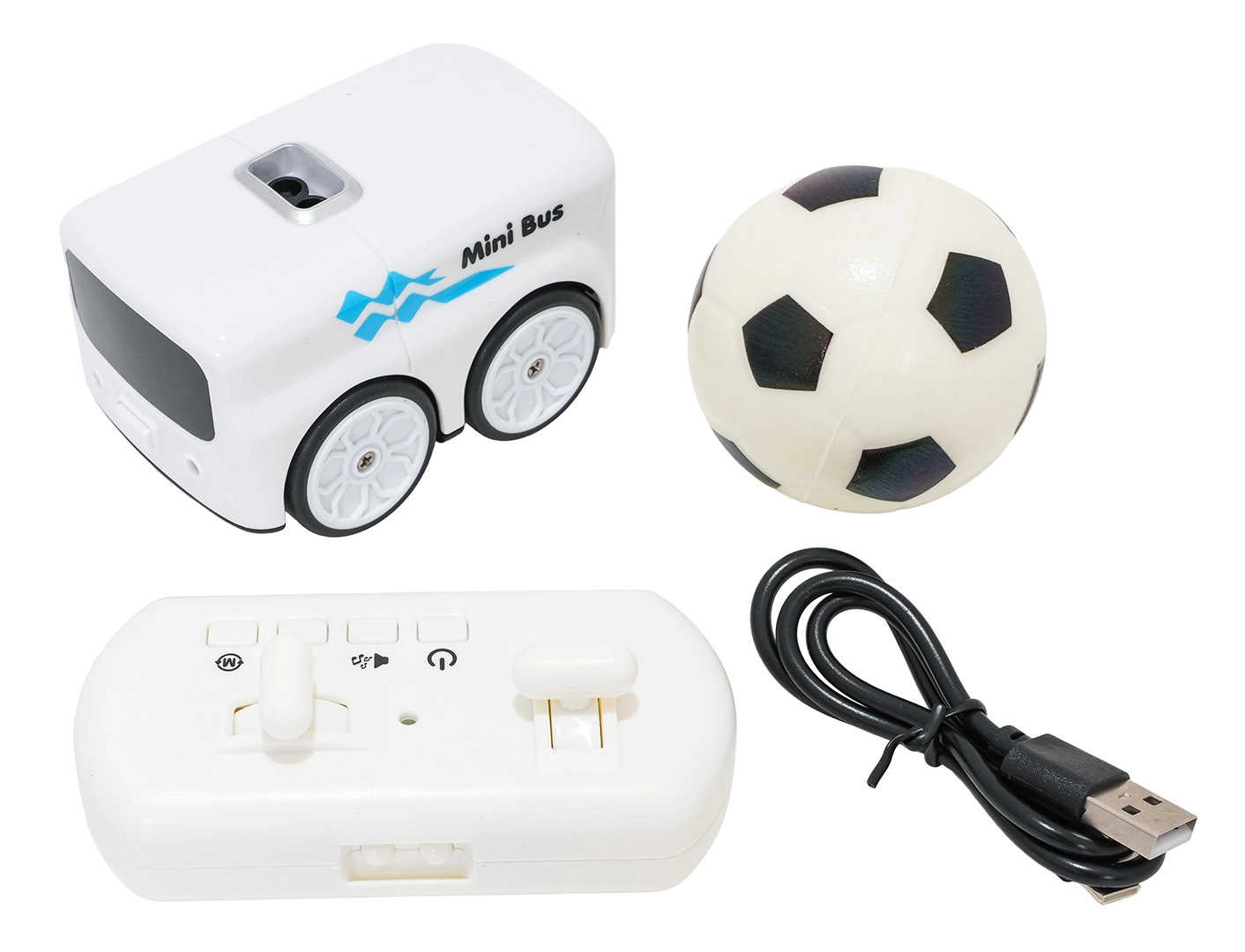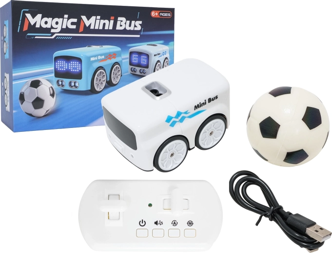 Igrača spodbuja ustvarjalno igro in razvoj koordinacije z več načini, vključno s sledenjem črti, predstavitvijo funkcij in 360° vrtenjem. Avtobus napaja polnilna baterija 3,7 V (v kompletu), upravljalnik potrebuje 2× AAA 1,5 V (nista priloženi). Kompaktne mere in mehka žoga zagotavljajo varno in udobno zabavo doma.