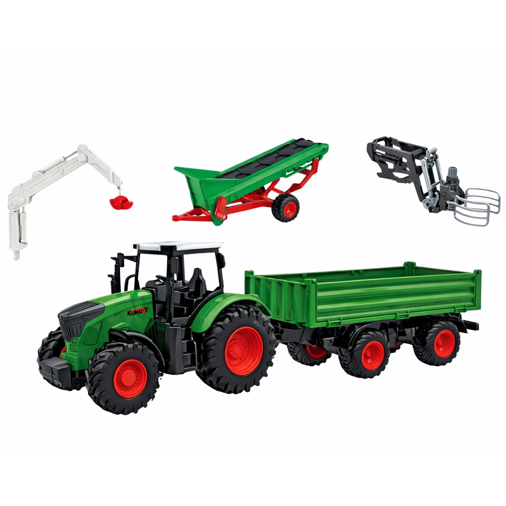 V kompletu so traktor z vlečno kljuko, prikolica, transporter, ograde z vrati, figurice kmetov in živali ter številna orodja in dodatki. Igra razvija fino motoriko, domišljijo in igro vlog.
