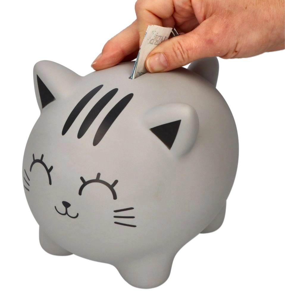 Ljubek in hkrati praktičen hranilnik v obliki sive mačke vam na zabaven način pomaga varčevati kovance in bankovce. Zaradi kompaktnih mer se prilega otroški sobi ali pisarni, kakovostna izdelava iz trpežnega PVC pa zagotavlja dolgo življenjsko dobo. Odlična darilo za ljubitelje mačk in hkrati stilski dodatek interierju. Velika prostornina, trpežen material in privlačen dizajn bodo podprli vaše varčevanje vsak dan.