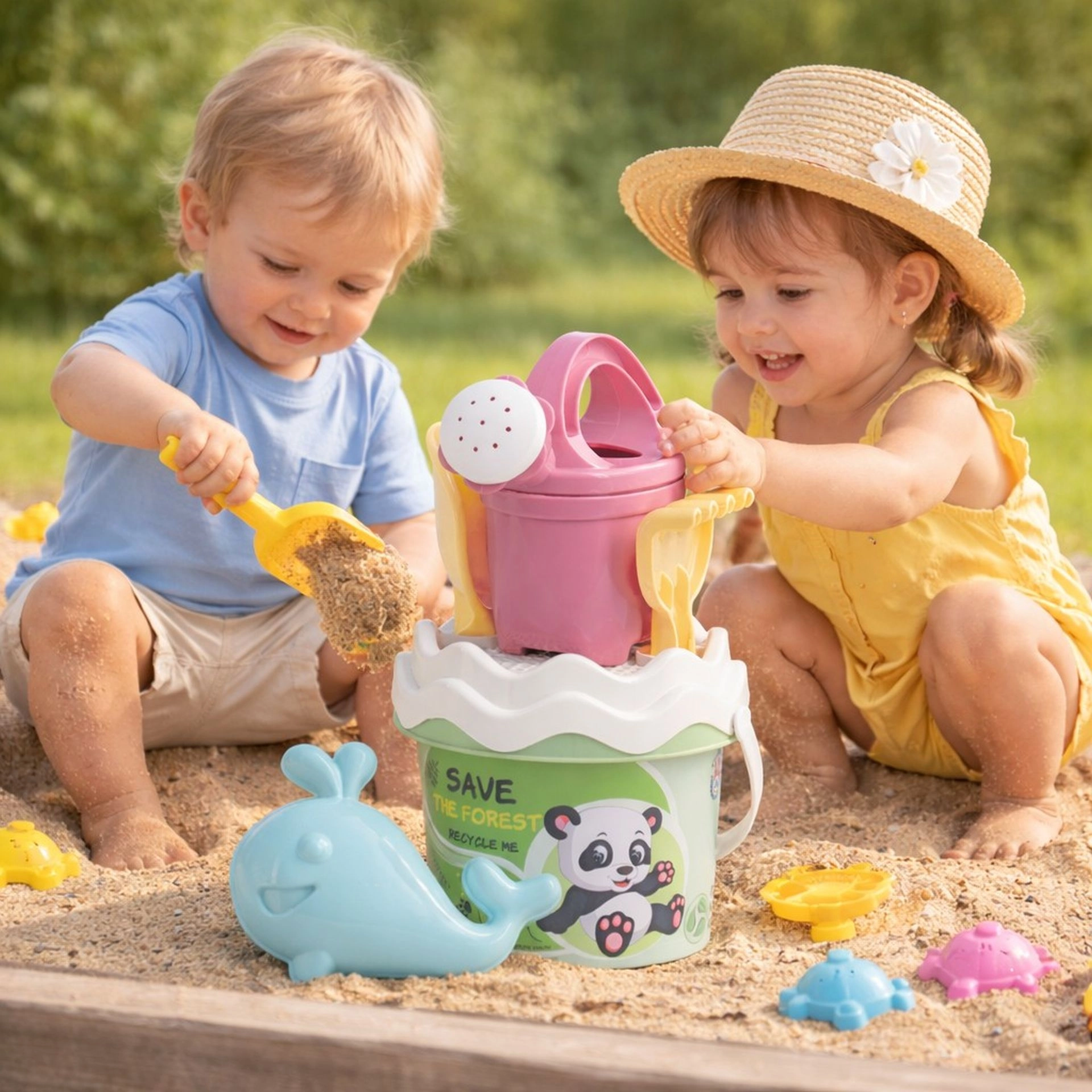 Vsebuje vse, kar imajo otroci radi: vedro z ljubkim potiskom pande, sito za čist pesek, funkcionalno kanglico s prostornino 0,5 l za gradnjo trdnih gradov, pa tudi lopatko, grabljice in modelček za oblikovanje. Zaradi kompaktnih mer je set preprost za prenašanje in shranjevanje.