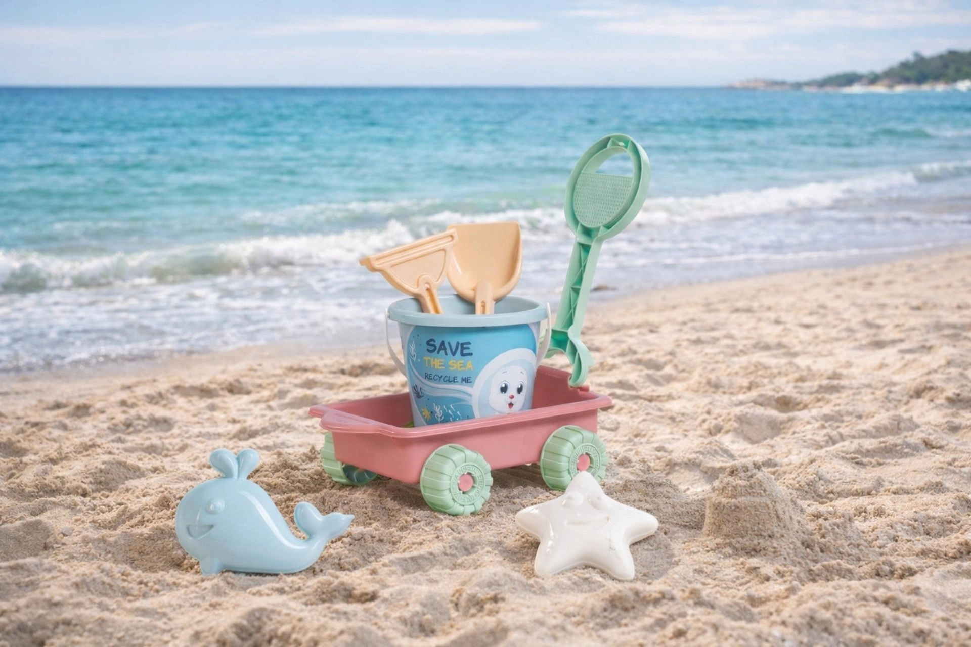 Vedro, lopatka, grabljice in dve modelčki (ribica in morska zvezda) spodbujajo domišljijo in fino motoriko. Vse je usklajeno v čudovitih pastelnih barvah.