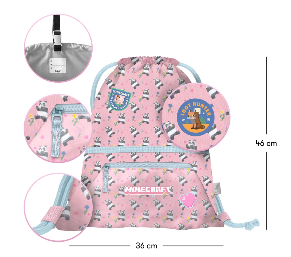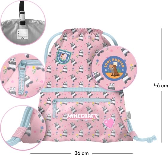 Praktična šolska vrečka z motivom MINECRAFT Panda in sprednjim žepom na zadrgo je idealna za copate, šport in prosti čas. Izdelana je iz trpežnega, pralnega materiala, ima vzdržljive zatezne vrvice za udobno nošenje ter zanko z zaponko za enostavno pripenjanje na nahrbtnik ali aktovko.