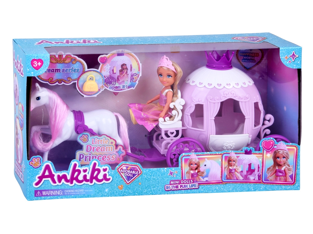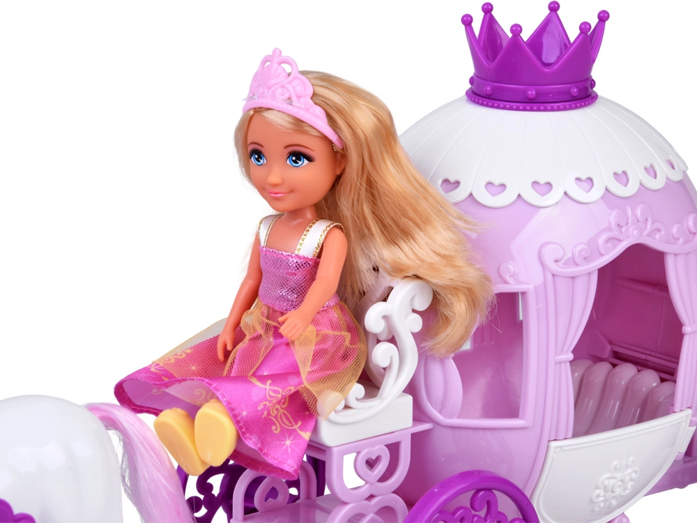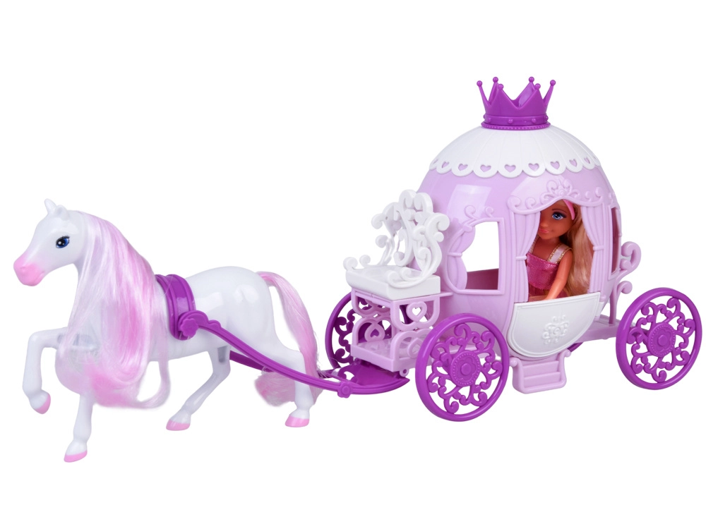 Ta očarljiv komplet prinaša vse za čarobno vožnjo v kraljestvo domišljije: malo princesko v rožnatih oblačilih s krono, okrašeno kočijo s krono in srčkastimi detajli ter belega konja z rožnato grivo in repom. Zaradi kompaktnih mer ga otroci zlahka vzamejo s seboj kamor koli.