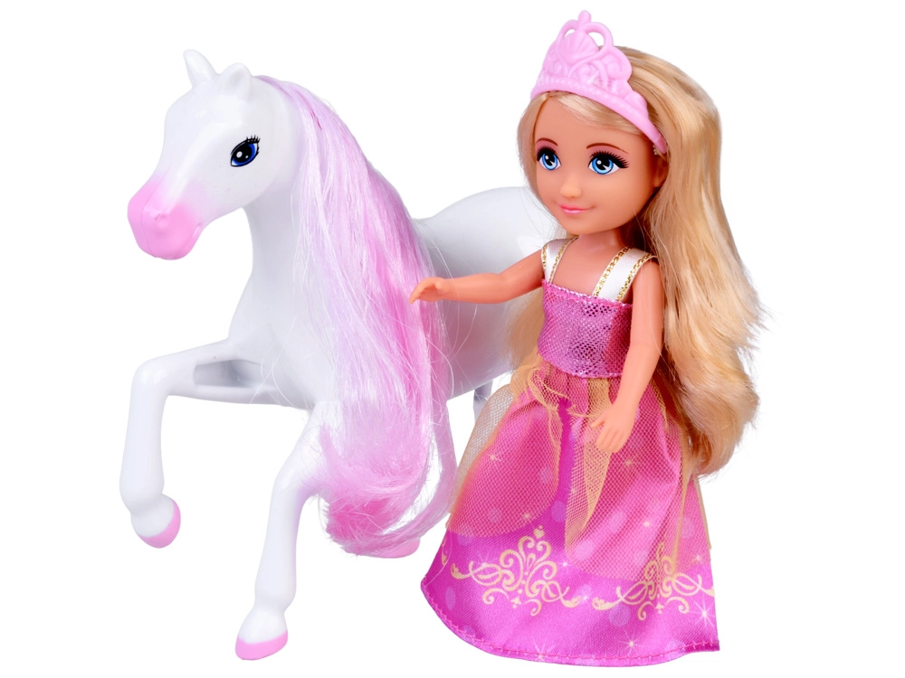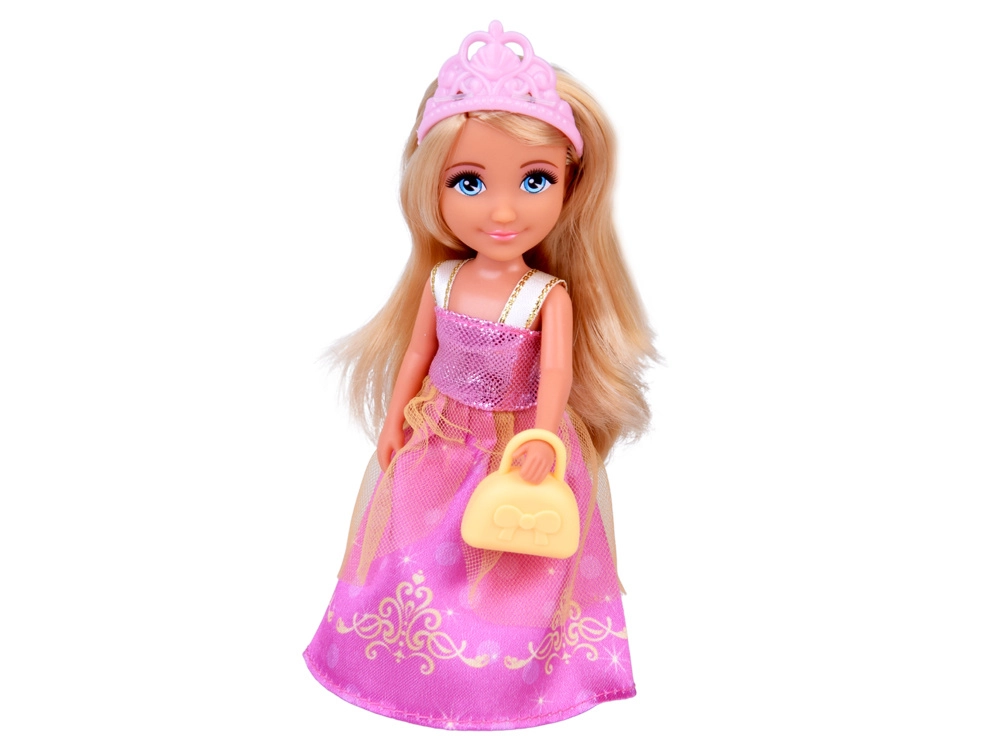 Punčka z dolgimi svetlimi lasmi, rožnato krono in bleščečo obleko. Idealna za igro vlog – od kraljevskih obiskov do plesov v palači.