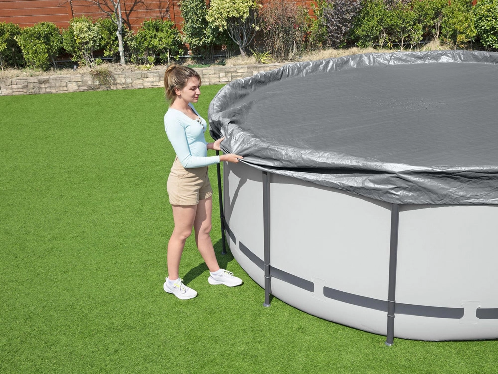 Okrogla pokrivna ponjava BESTWAY Premium je zasnovana za nadzemne bazene s premerom 4,27 m. Vzdržljiv material z ojačitvijo in UV-zaščito podaljšuje življenjsko dobo in pomaga ohranjati čistejšo vodo z manj potrebe po vzdrževanju. Ponjava se preprosto namesti in zaradi čvrstega zategovanja dobro kljubuje običajnim vremenskim razmeram.
