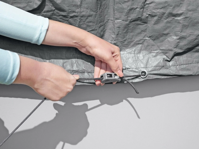 Obodno zatezanje z varnostno blokado zagotavlja trdno in tesno pritrditev ponjave na bazen, zato prenese običajen veter in vam pomaga zmanjšati čiščenje vode ter porabo kemikalij. Idealna izbira za daljšo čistočo vode in zaščito bazena skozi celotno sezono in izven nje.