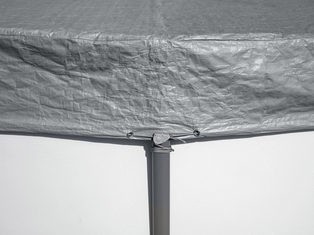 Obodno jekleno lanko z blokado varno zategne ponjavo okoli roba bazena, zato ostane na mestu tudi ob močnejših sunki vetra.