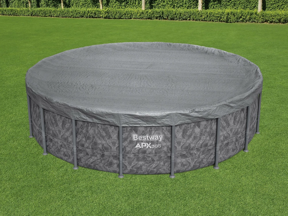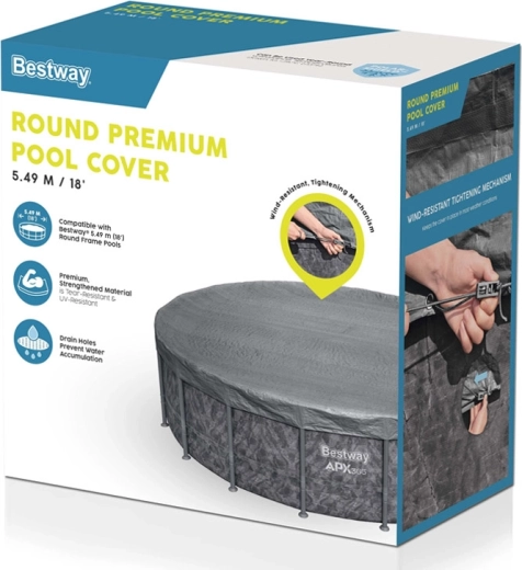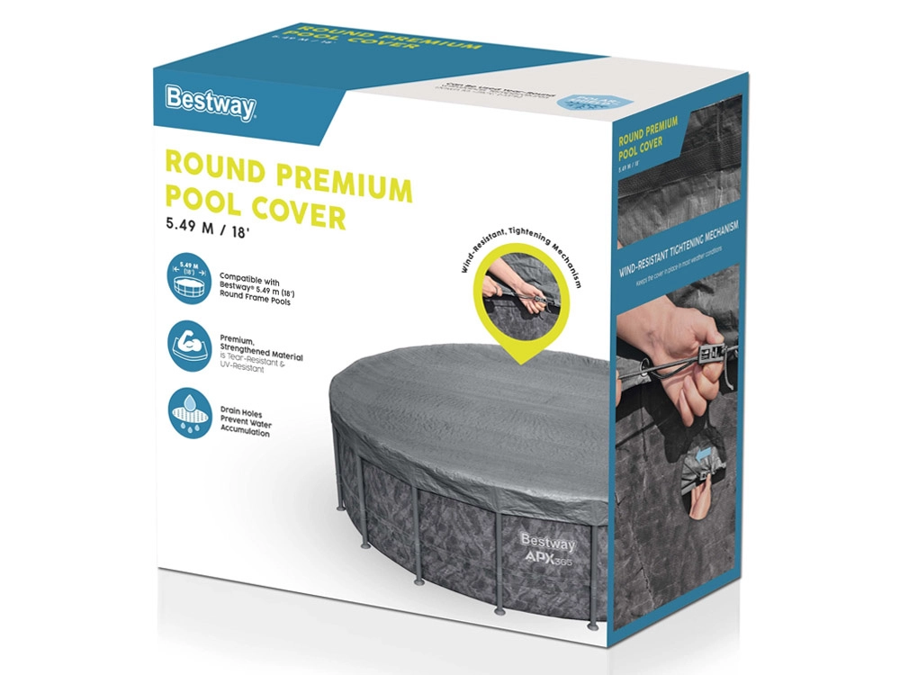 Kakovostna prekrivna ponjava BESTWAY za okrogle bazene s premerom 5,49 m je zasnovana za celoletno uporabo. Ojačan material z zaščito pred UV‑sevanjem je odporen proti trganju in vremenskim vplivom, medtem ko površinska obdelava Polar‑Shield pomaga ohranjati lastnosti tudi pri nizkih temperaturah.