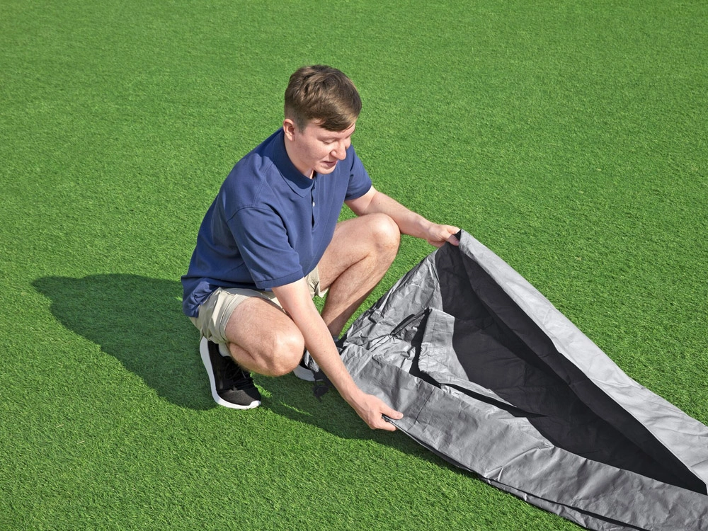 Praktične odtočne odprtine odvajajo deževnico, zato se na ponjavi ne tvorijo težke luže. Vetroodporen pritrditveni sistem drži ponjavo trdno na mestu in zagotavlja zanesljivo prileganje robu bazena.