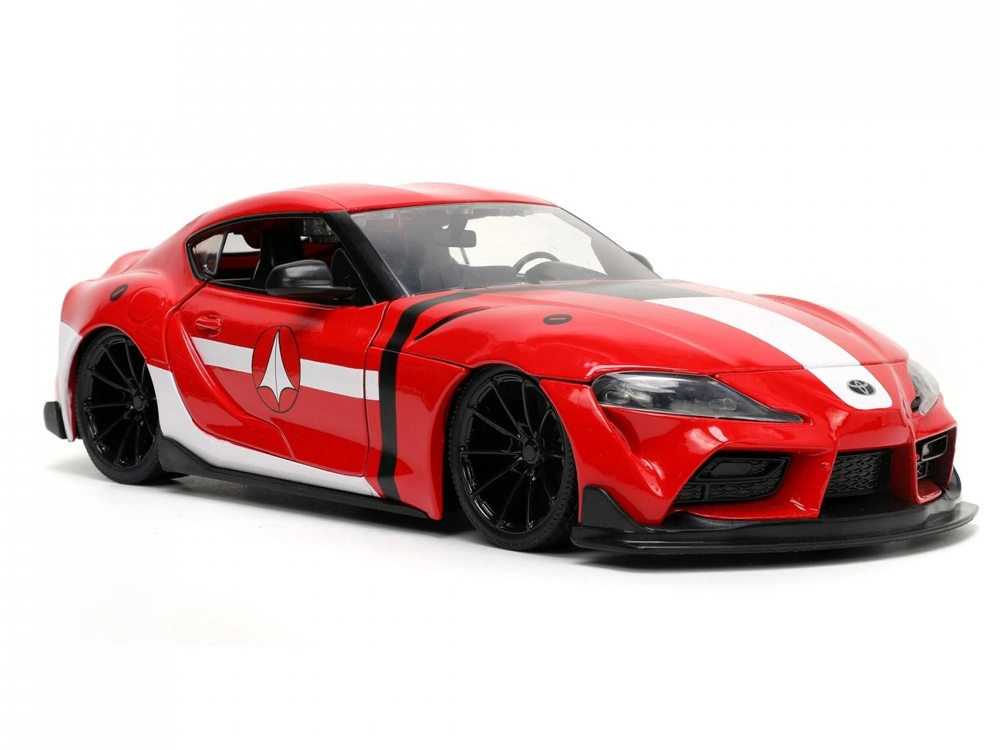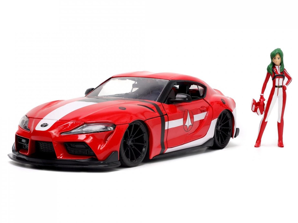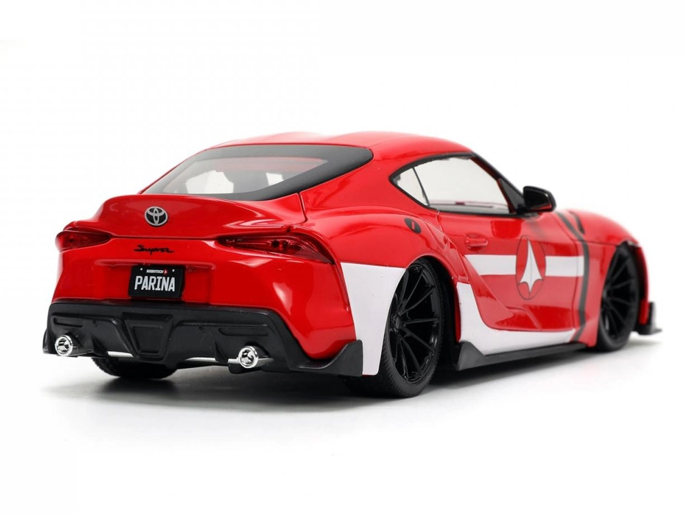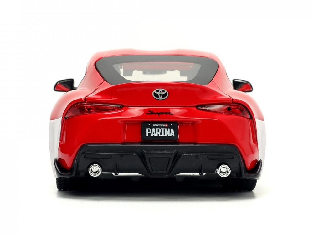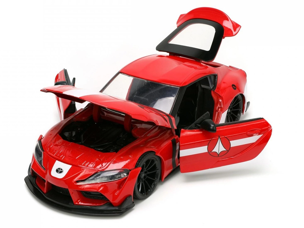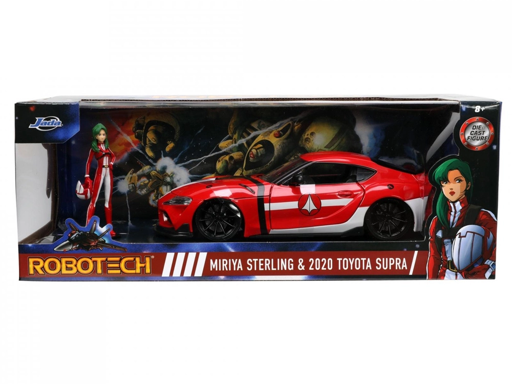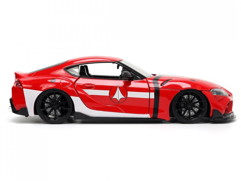 Dodelan model Toyota Supra 2020 v rdeči barvi z belimi črtami zvesto povzema športni značaj izvirnika in povezuje avtomobilski dizajn z ikoničnim univerzumom ROBOTECH. Zaradi kovinske die-cast konstrukcije in skrbno obdelanih detajlov deluje kot pravi avtomobil v miniaturi.