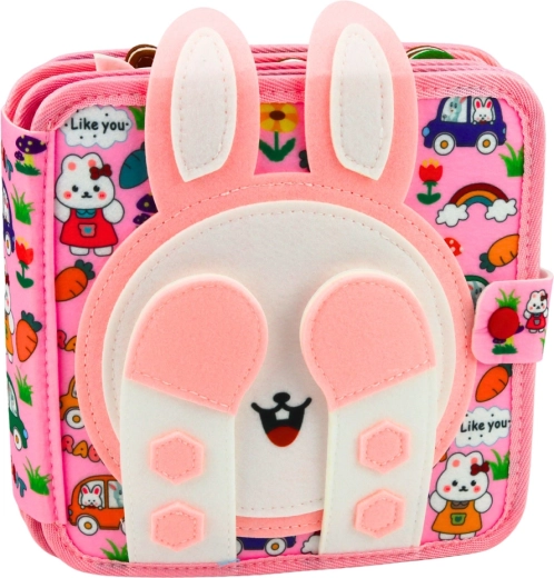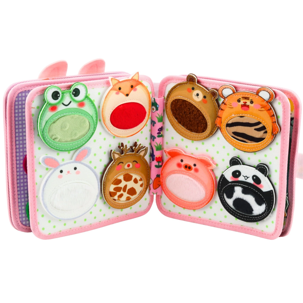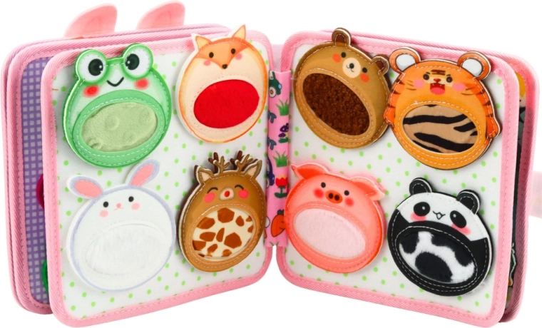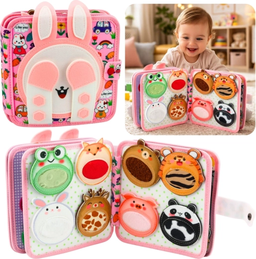 Odkrijte igrivo čutno knjižico iz mehkega filca z motivom rožnatega zajčka, ki spodbuja fino motoriko, čutni razvoj in učenje barv ter oblik. Zahvaljujoč premičnim in pritrdivim elementom otroci urijo koordinacijo oko–roka in osredotočenost, hkrati pa uživajo v varni in tihi igri doma in na poti.