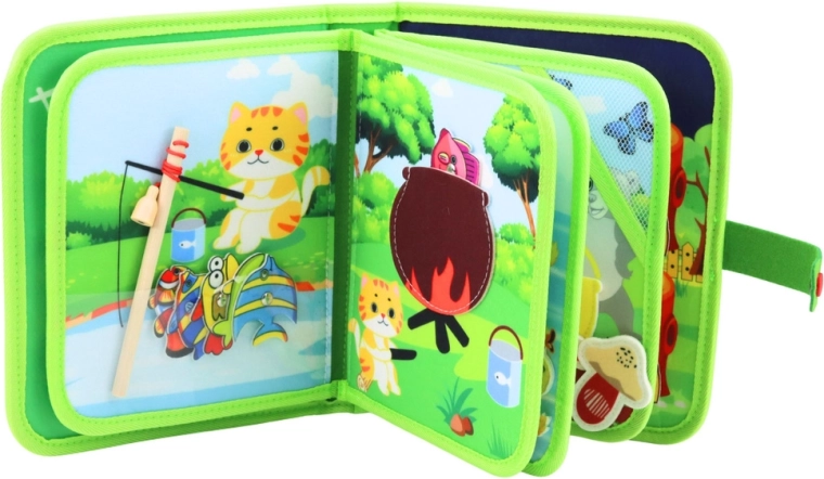 Interaktivna tekstilna knjižica iz mehkega filca otroke vabi v svet divjih živali in narave. Vsaka stran ponuja nove naloge – premikanje, razvrščanje in ujemanje delčkov, zapenjanje ali pripenjanje – ter podpira samostojno igro, osredotočenost in razvoj domišljije. Zaradi kompaktnih mer je odličen spremljevalec v avtu, letalu in v vrtcu.