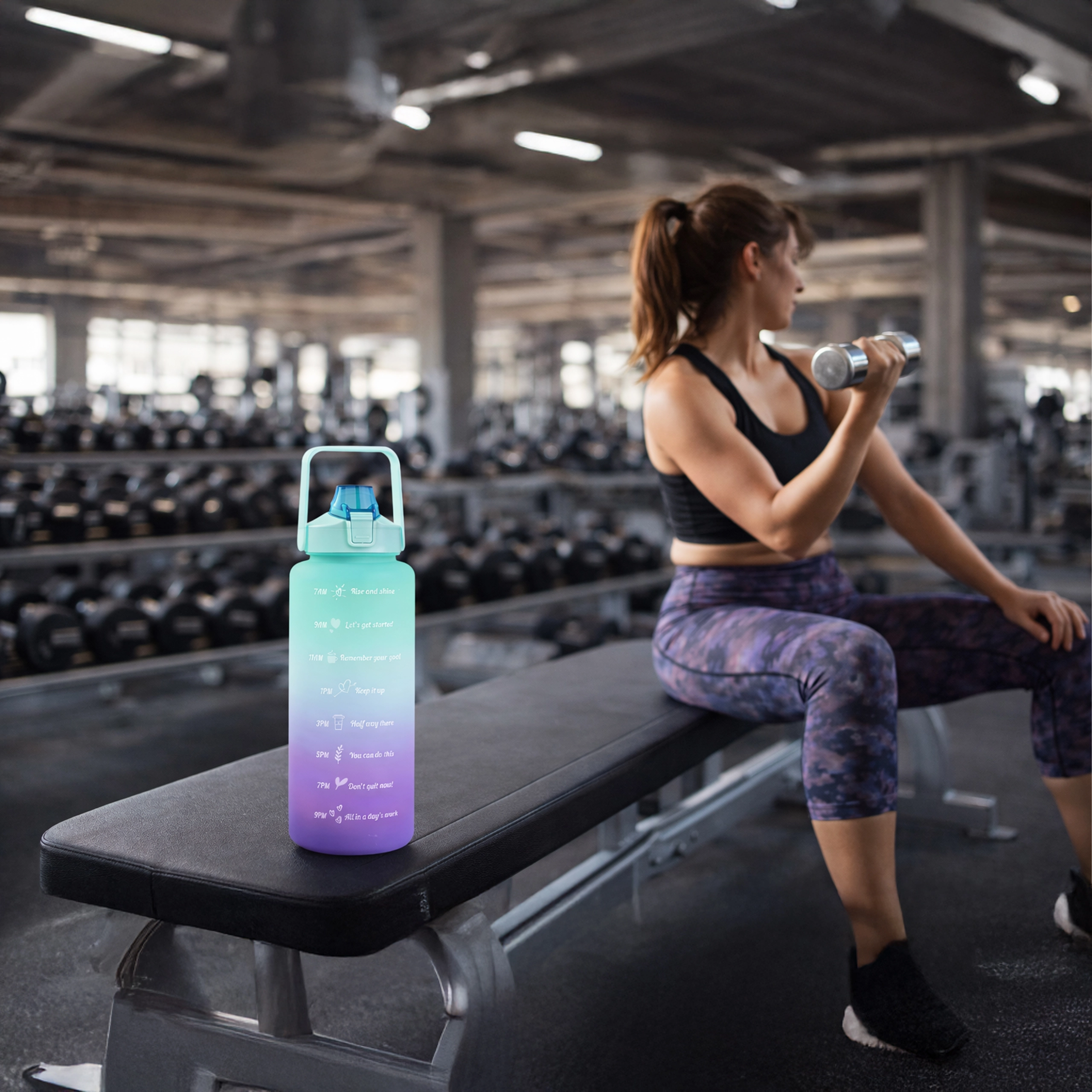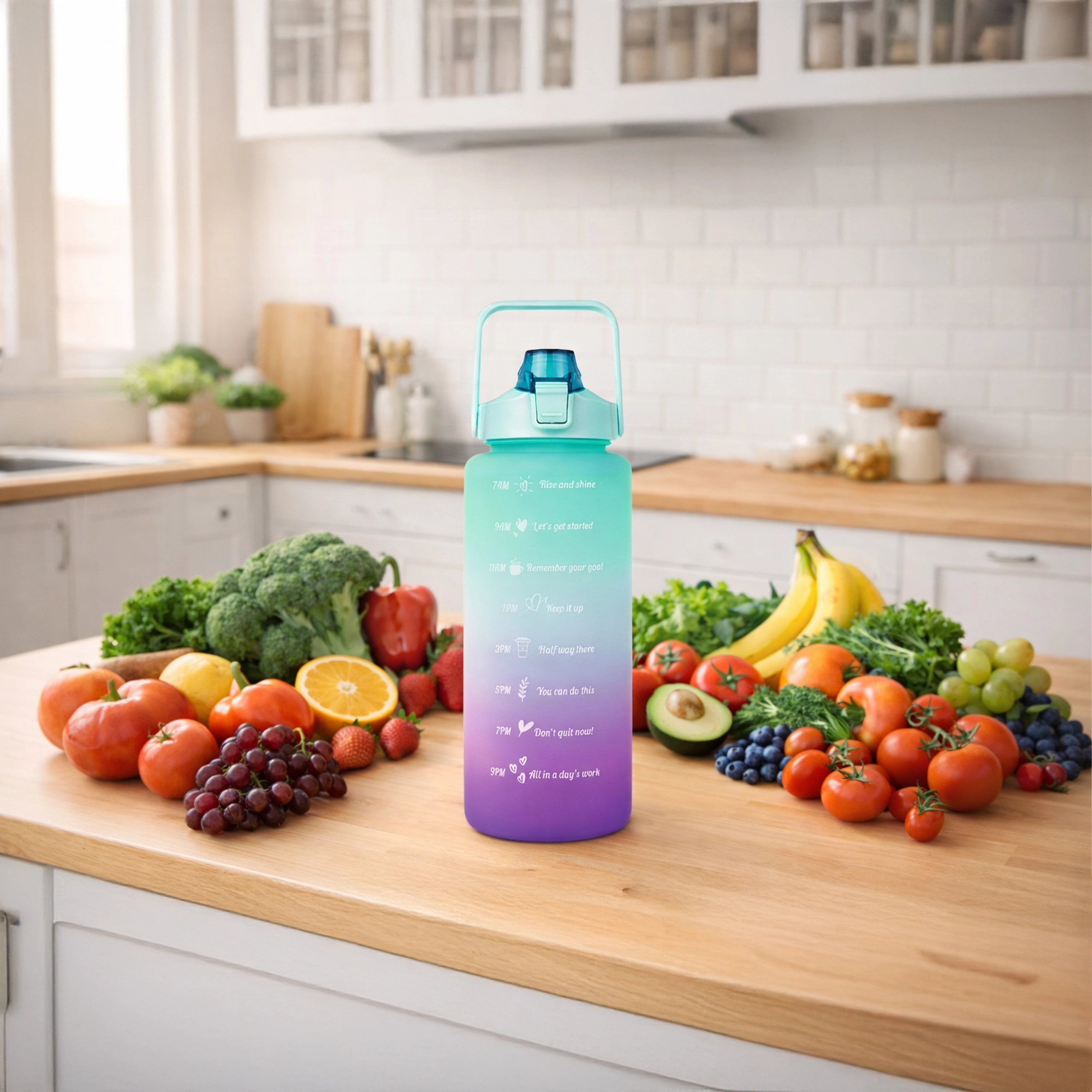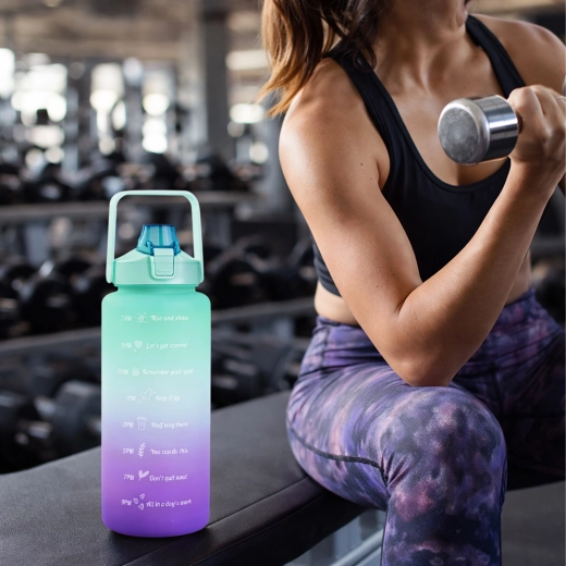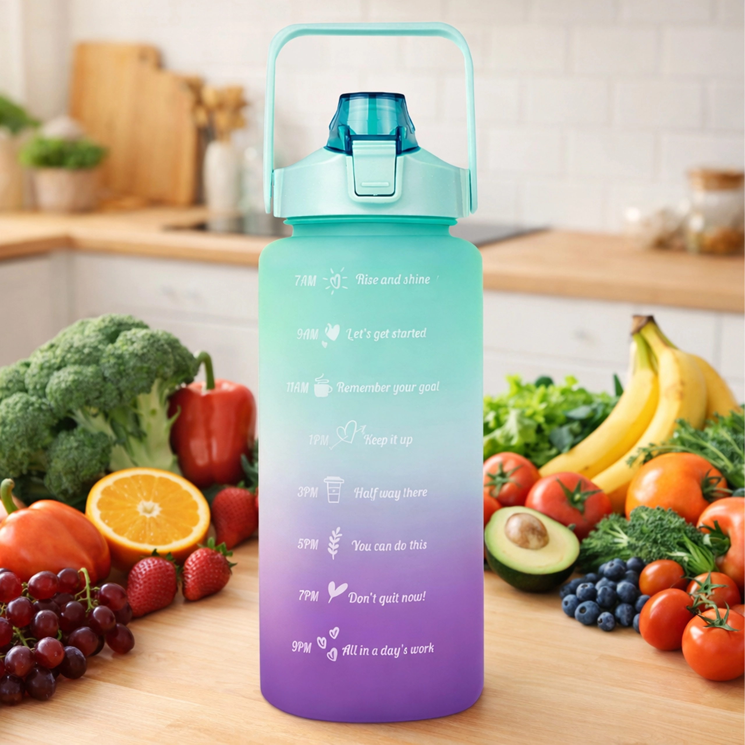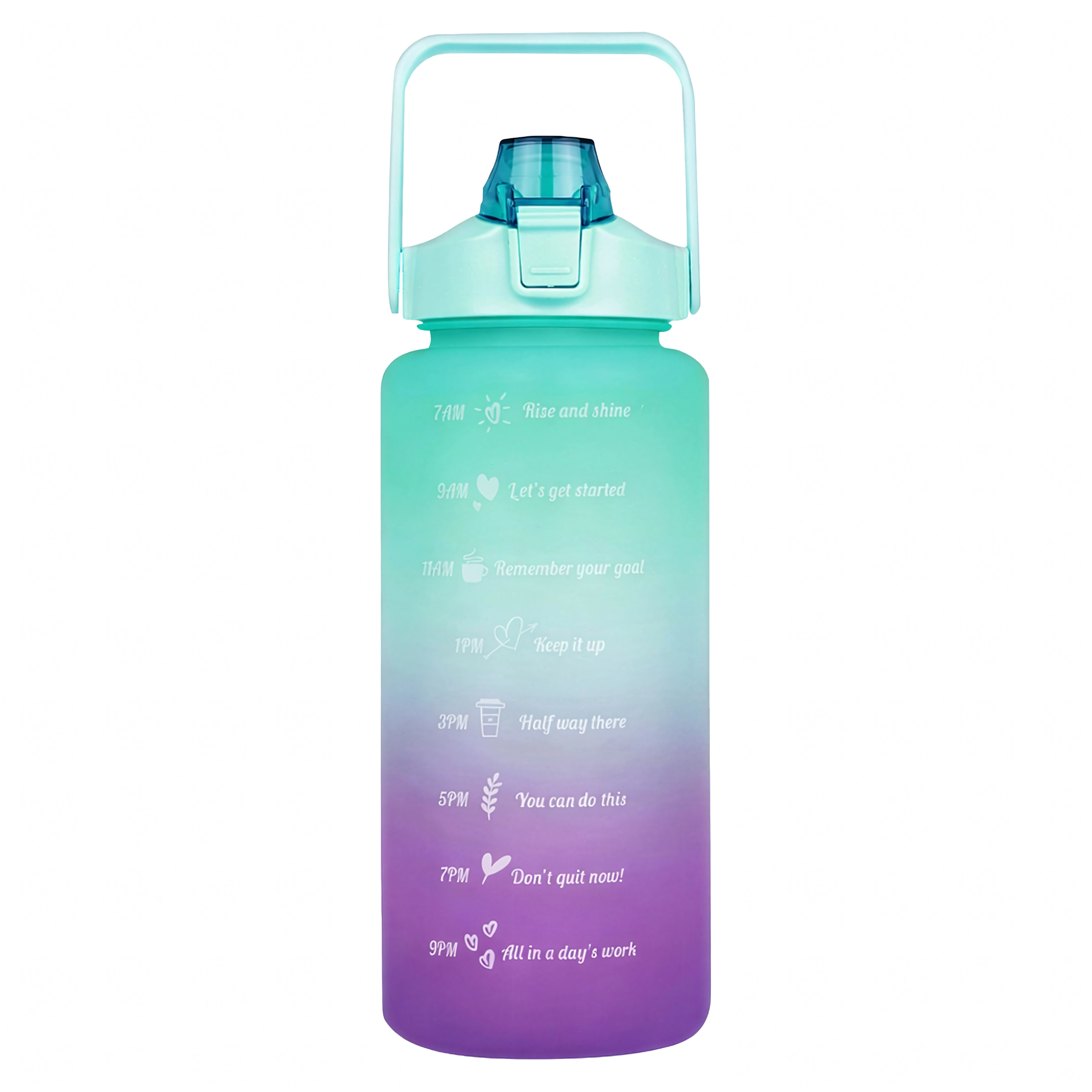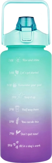 Velikokapacitetna motivacijska steklenica za vodo 2 l vam pomaga preprosto spremljati dnevni vnos tekočine. Na ohišju steklenice so pregledne časovne oznake s spodbudnimi gesli, ki vas vodijo od jutra do večera. Priročen flip pokrov s slamico zagotavlja hitro pitje brez polivanja, varnostni zaklep pa ščiti pred samodejnim odpiranjem v torbi.
