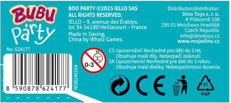 Bubu party je živahna otroška igra, polna barvitih kostumov in prikupnih pošasti. Otroci v njej na zabaven način trenirajo spomin, zbranost in hitro odločanje. Zaradi kratkih krogov in enostavnih pravil je odlična kot družinska igra doma in na poti.