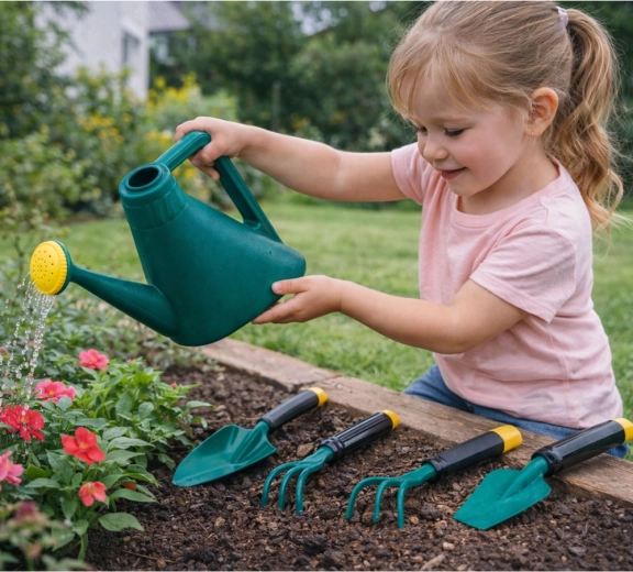 Praktična prenosna škatla ohranja vse na enem mestu – otroci lahko svoje orodje vzamejo kamor koli na vrt in po igri hitro pospravijo. Skupno vrtnarjenje krepi odgovornost in odnos do narave.