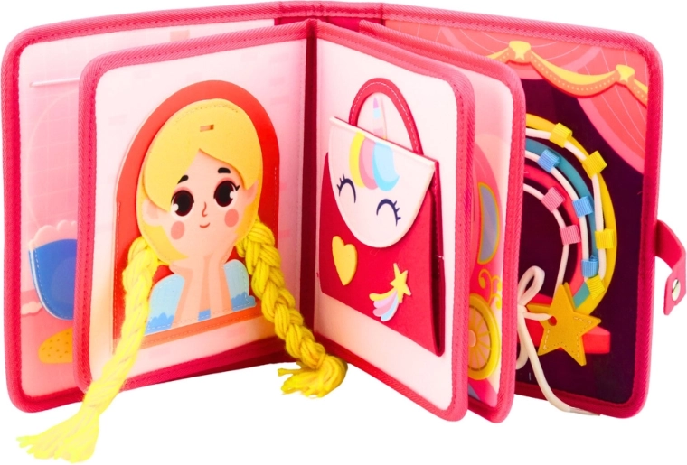 Vsaka stran ponuja nove naloge – od pletenja las do zavezovanja in odpiranja žepka. Zaradi kompaktnih mer in varne zasnove je knjižica odlična za v avto, na obiske in v vrtec. Rožnata in pisana izvedba bo navdušila male ljubitelje pravljičnega sveta.