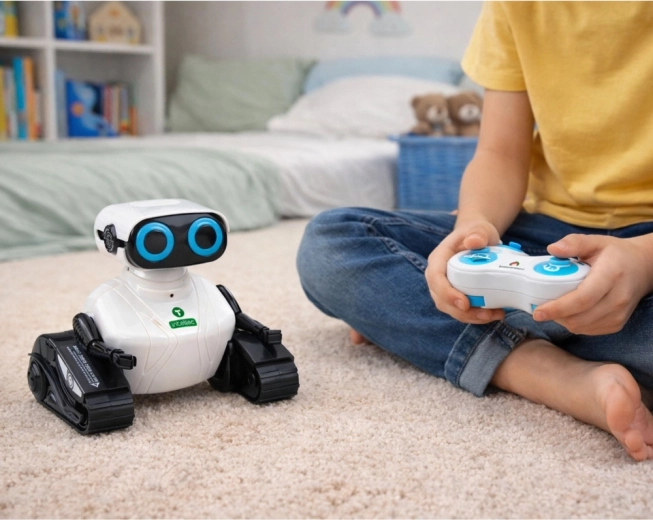 Odkrijte pametno igračo, ki združuje tehnologijo in zabavo. Ta interaktivni robot z gosenicnim podvozjem z lahkoto vozi po tleh, panelih in preprogi. S preglednim upravljalnikom otrok robotu preprosto določi smer, zažene glasbo, zvočne učinke in plesni način. Živo modre LED oči dodajo futurističen videz in še večji učinek pri igri.