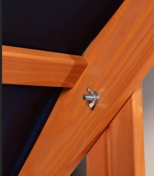 Nastavljiva strešica iz odpornega, vodoodpornega blaga ščiti pred soncem in rahlim dežjem, po koncu igre pa je peskovnik mogoče preprosto prekriti. Zahvaljujoč predvrtanim luknjam in preglednim navodilom je montaža hitra in brez odvečnega orodja.