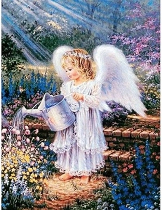 Diamantno slikanje je idealna dejavnost za vse starostne skupine – posebne spretnosti niso potrebne. Z aplikacijskim peresom nanašate drobne kamenčke na predtiskano in lepljivo platno po simbolih. Rezultat je bleščeča slika s podrobnim motivom angela z zalivalko na vrtu, ki polepša vsak interier.