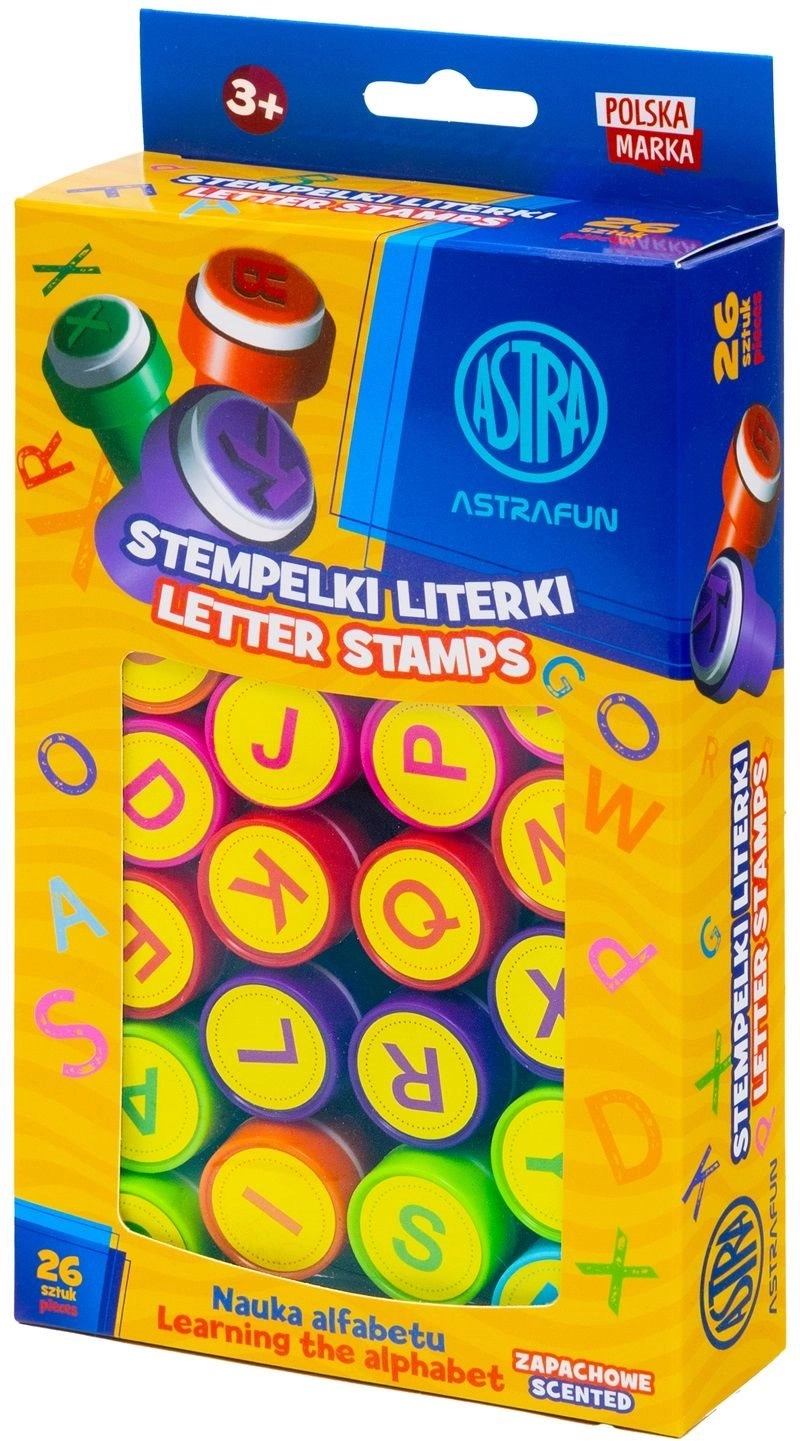 Komplet dišečih žigov ASTRA je idealen pripomoček za predšolske otroke in šolarje. Otroci se na igriv način urijo v črkah, tvorijo besede in razvijajo fino motoriko. Vsak žig je zaprt, zato ga je enostavno shranjevati in črnilo ne izsuši.