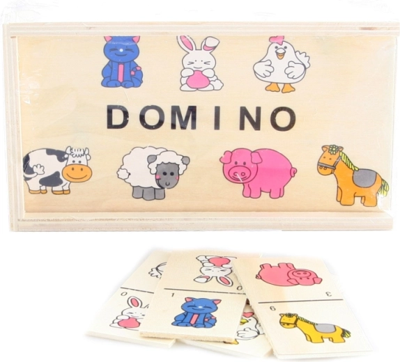 Odkrijte zabavno igro za najmlajše – lesene domine z živalmi, ki razvijajo logiko, fino motoriko in prepoznavanje domačih živali. Praktična lesena škatlica z merami približno 15,5 × 9 × 4 cm zagotavlja enostavno shranjevanje in prenašanje. Primerno za otroke od 3 let.