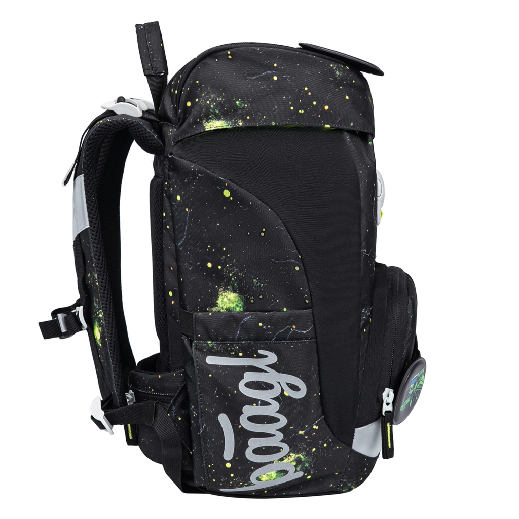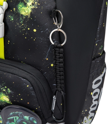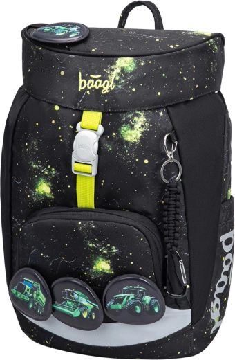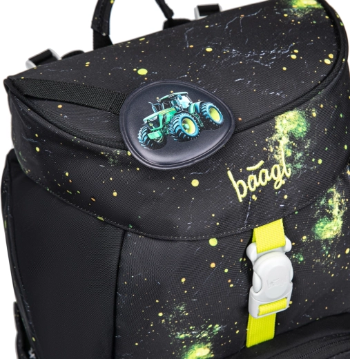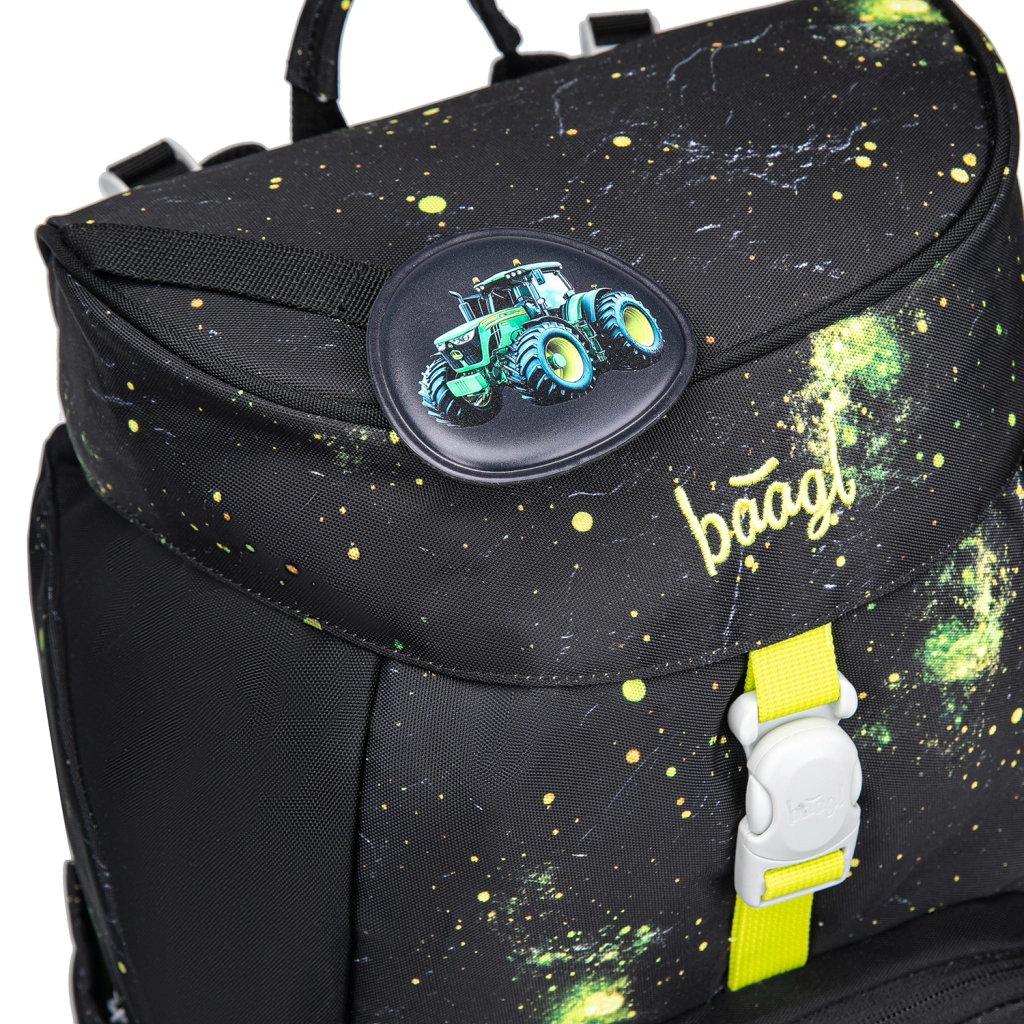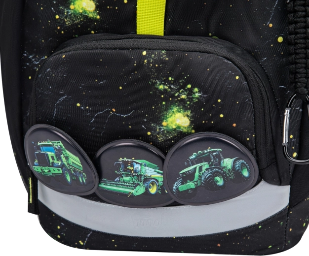 Praktična enoprekatna notranjost z notranjim žepom in elastiko za pritrditev map olajša organizacijo šolskih potrebščin. Nahrbtnik je izdelan iz recikliranih, vodoodbojnih materialov, dopolnjen z izrazitimi odsevnimi elementi za večjo vidnost in varnost. Intuitivni sistem zapiranja Magnetic Click zlahka obvlada tudi prvošolec. Dizajn je mogoče preprosto spreminjati z odstranljivimi našitki (patchi) z motivom traktorja.