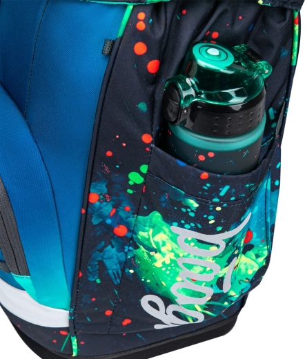 Praktična oprema vključuje glavno komoro z organizatorjem, lahke plastične mape za zaščito zvezkov, sprednji termo žep za malico ter zgornji pokrov z magnetnim zapiranjem, ki se samodejno zapre. Material je recikliran in vodoodbojen s certifikatom GRS in dopolnjen z odsevnimi elementi. Igriv dizajn je mogoče prilagoditi z zamenljivimi značkami Baaglies. Del seta je tudi enoslojna peresnica z visokokakovostno zadrgo YKK, gumicami za pisala in okencem za urnik, pa tudi večnamenska vrečka s sprednjim žepom na zadrgo za obutev ali športno opremo.