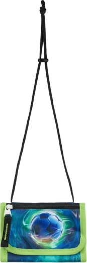 Vratna denarnica z nastavljivo vrvico ščiti žepnino in dokumente. Žep na zadrgo in preklop na ježek, športni nogometni dizajn, usklajen s kompletom.