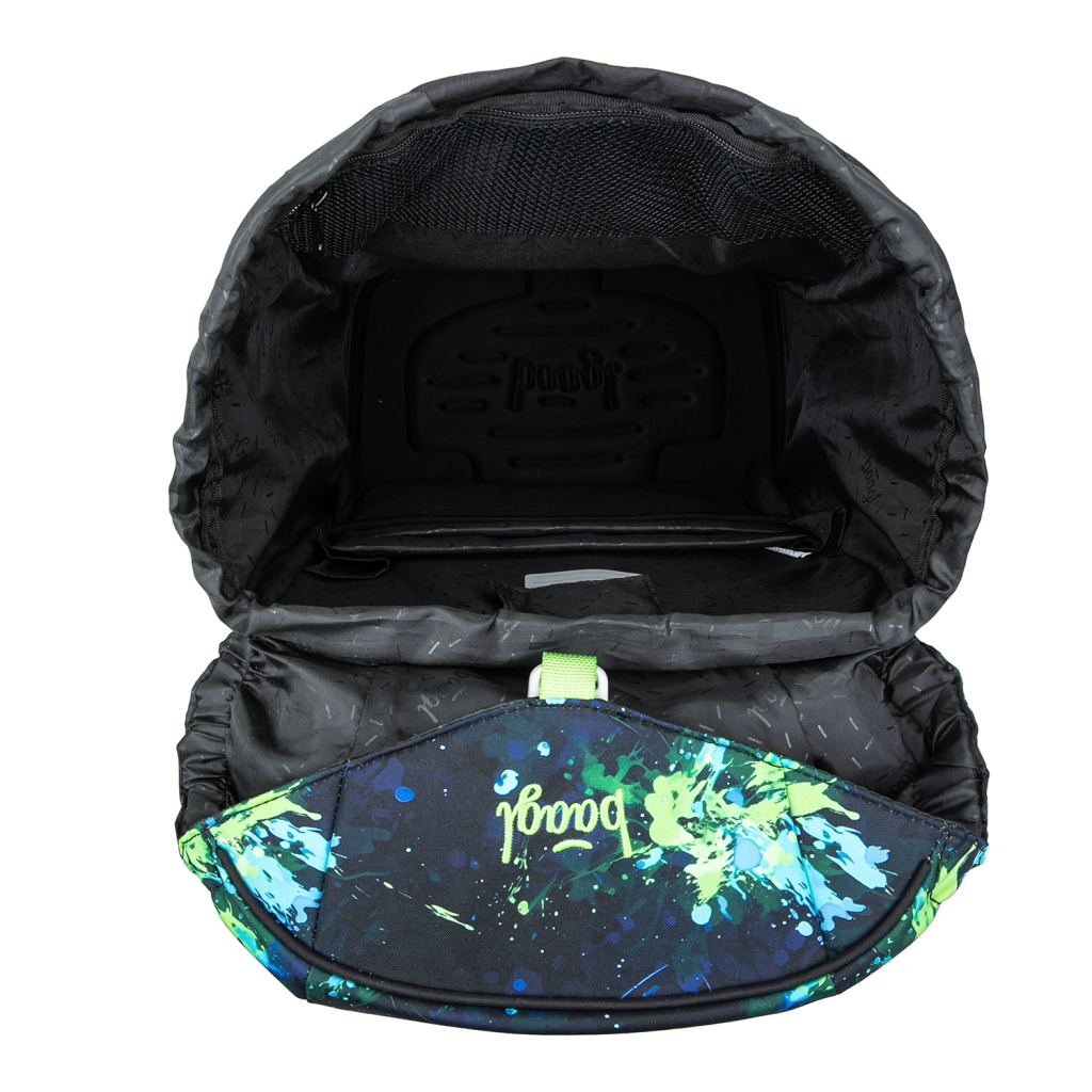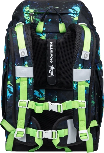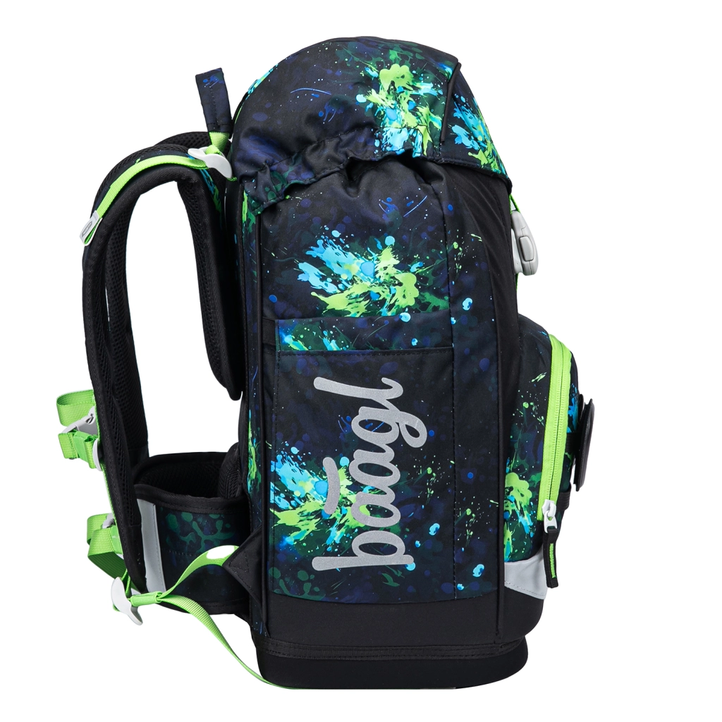 Notranja razporeditev vključuje glavni predal z organizatorjem, lahke plastične plošče pa ščitijo zvezke. Sprednji termo žep ohranja malico dlje časa svežo in preprečuje širjenje vonjav. Materiali so reciklirani in vodoodporni, z poudarkom na varnosti zahvaljujoč odsevnim elementom. Dizajn z zamenljivimi značkami (Baaglies) omogoča otrokom enostavno personalizacijo nahrbtnika. Del kompleta so prostorna enonadstropna peresnica z dvema preklopoma (brez polnila), vrečka za obutev ali krožke s karabinom za pripetje na nahrbtnik, praktični predpasnik/ovratnik za preobuvanje ali zaščito ter vratna denarnica za žepnino in dokumente.