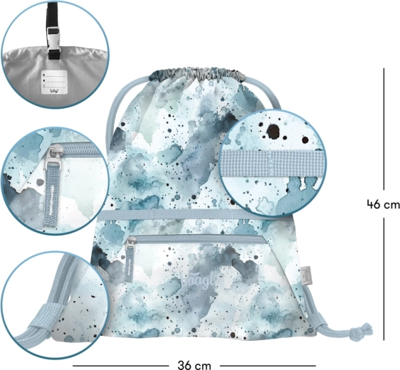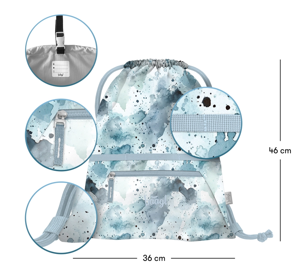 Zahvaljujoč trpežnemu in pralnemu materialu zdrži vsakodnevno uporabo. Močne zatezne vrvice omogočajo udobno nošenje na hrbtu, praktična zanka z zaponko pa zagotavlja preprosto pripenjanje na nahrbtnik ali aktovko.