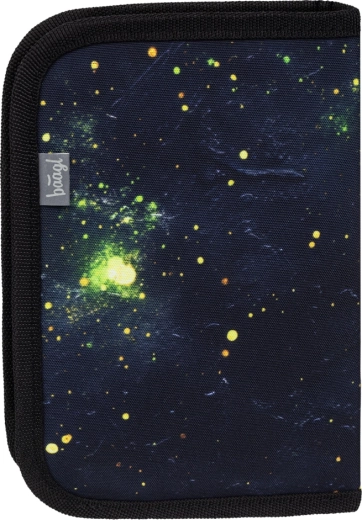 Notranjost je zasnovana za maksimalno preglednost – peresnik se po odprtju lahko v celoti razpre, najdete tu žepek za drobnarije, okence za urnik ter čvrste elastike, ki varno držijo tudi trikotne barvice in flomastre. Material iz recikliranih vlaken s certifikatom Global Recycled Standard (GRS) potrjuje prijaznost do okolja.