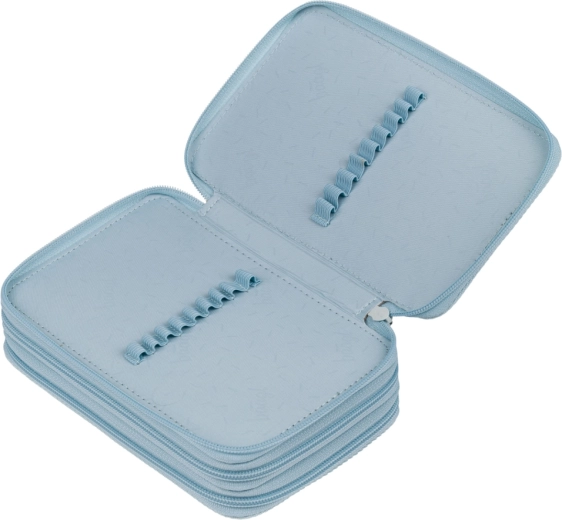 Premišljena notranja razporeditev z elastičnimi zankami varno sprejme tanke in debele pisalne potrebščine – od barvic in flomastrov do kulijev, ravnil ali drobnih pripomočkov. Ojačano hrbtišče olajša zapiranje, zadrga po obodu poskrbi za varno shranjevanje vsebine, zaobljeni robovi pa ščitijo peresnik in njegovo opremo.