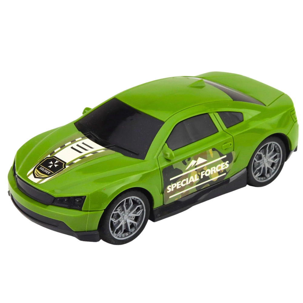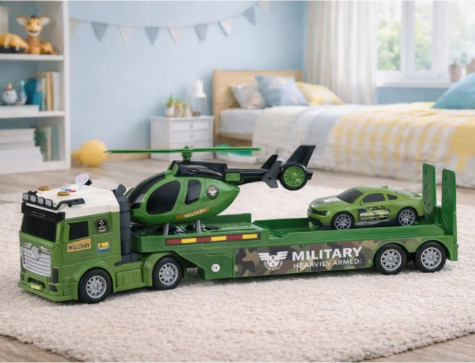 Otroški vojaški set v zeleni kamuflaži vsebuje tovorno vozilo s prikolico, helikopter in vojaški športni avto. Realistične podrobnosti, napisi MILITARY ter svetlobni in zvočni učinki v vlačilcu spremenijo igro v akcijsko misijo. Idealno za otroke, ki imajo radi specialne operacije, prevoz tehnike in kreativne scenarije.