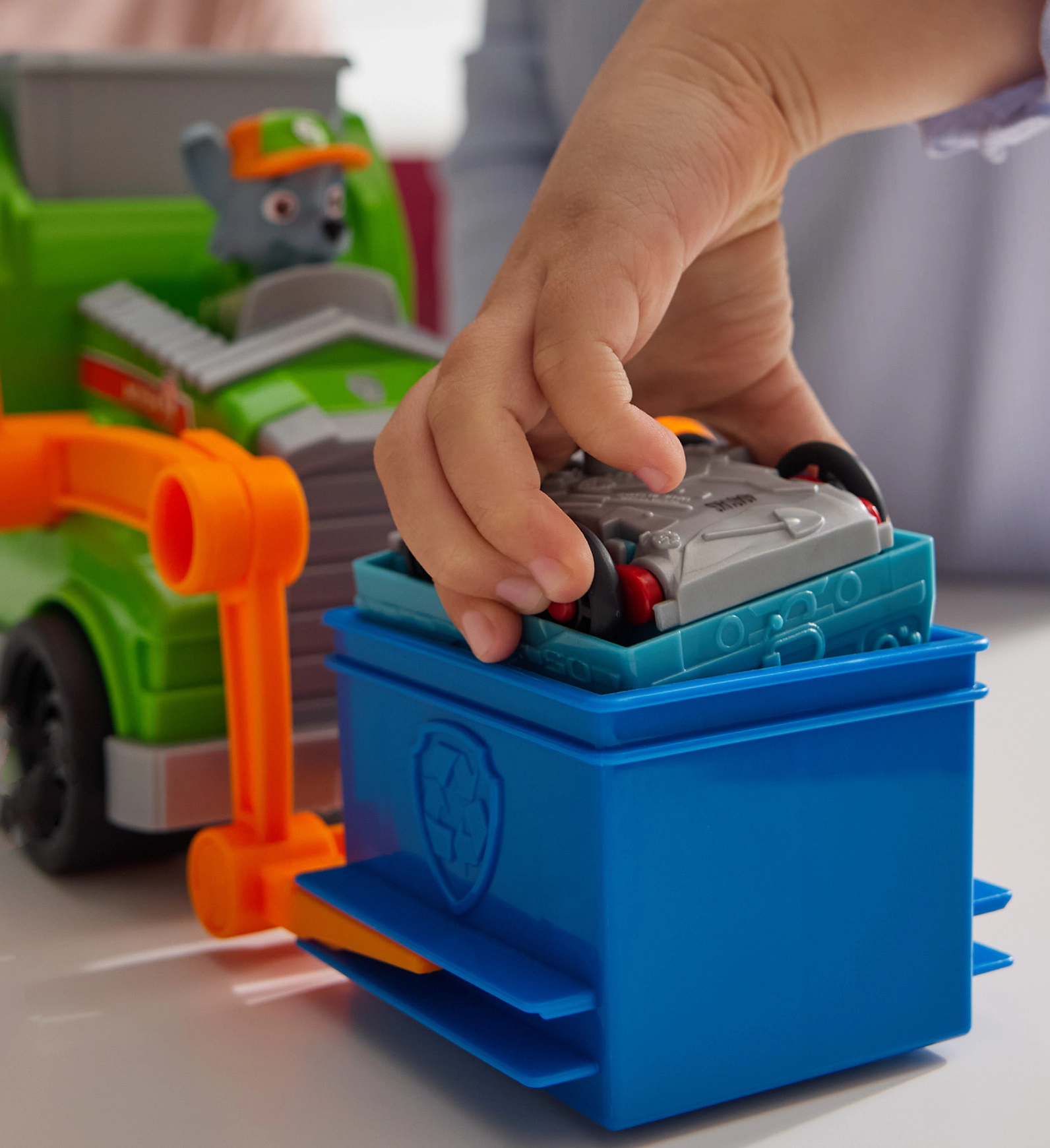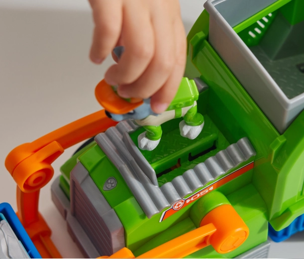 Priljubljeni junak Rocky je pripravljen otroke učiti recikliranja in pametnega preoblikovanja odpadkov v koristne stvari. Reciklažno vozilo Crush ’N’ Roll ponuja realistične elemente – koš za odpadke, manipulacijski voziček in ročico, ki sproži drobljenje in preobrazbo zmečkanega vozila v mini avtomobilček. Otroci lahko Rockyja posadijo v kabino in se odpravijo na nove misije kot v seriji PAW PATROL.