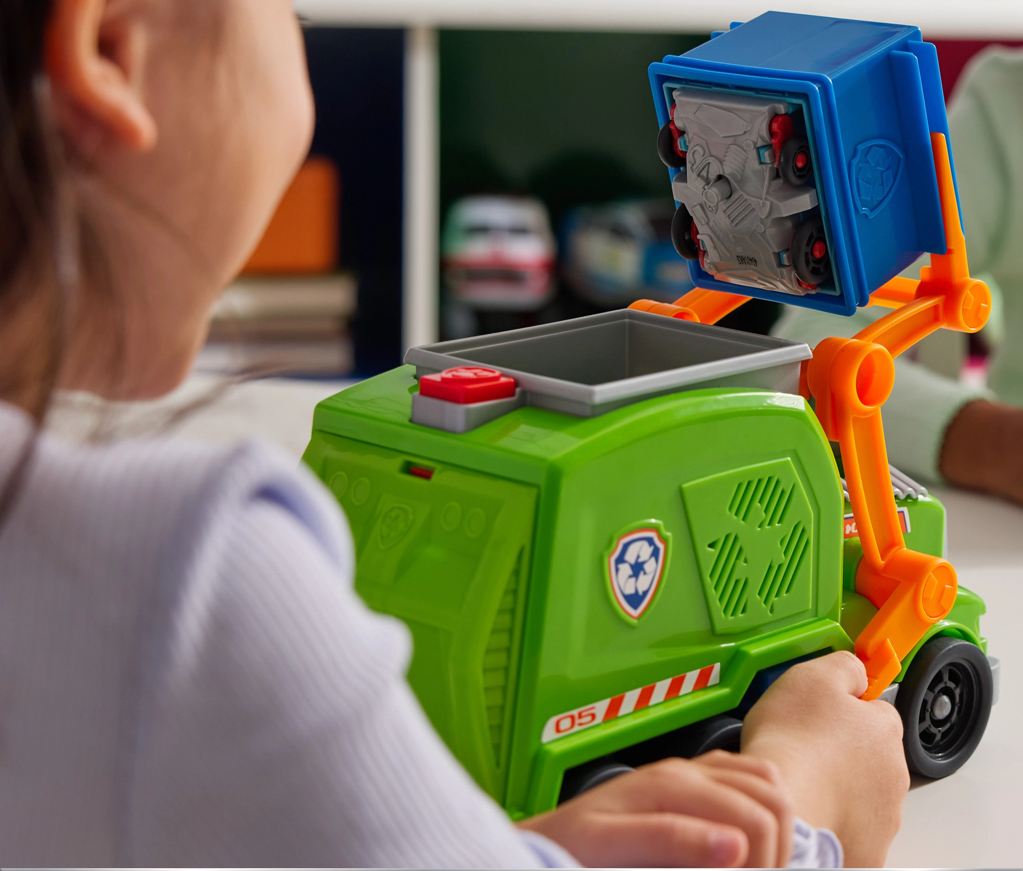 Dvignite koš, premaknite zmečkan avtomobilček v stroj in aktivirajte drobljenje in preobrazbo. Realistična igra kot v PAW PATROL spodbuja okolju prijazne navade.
