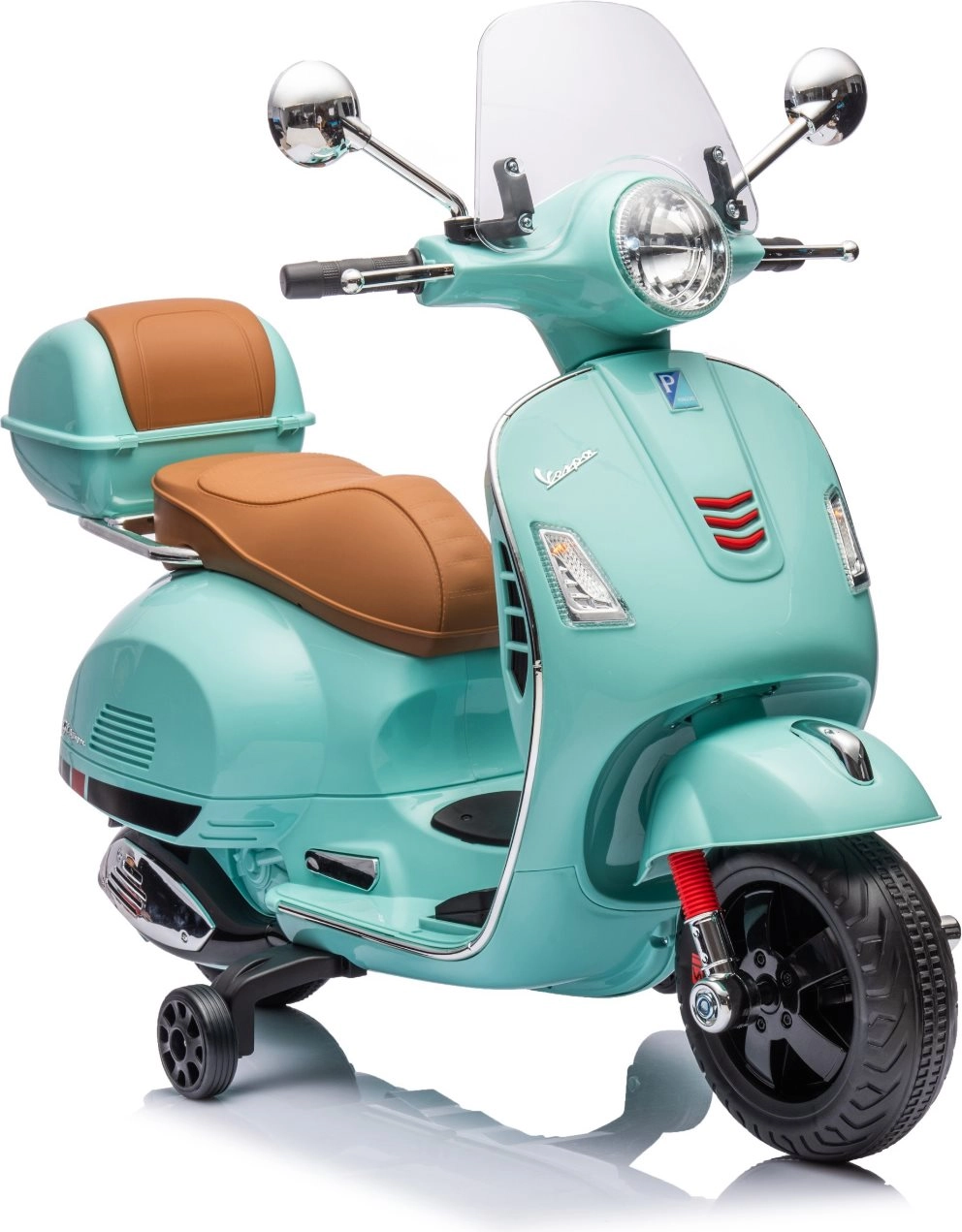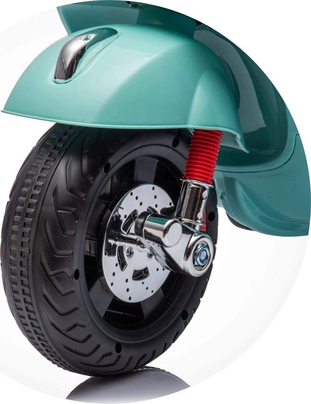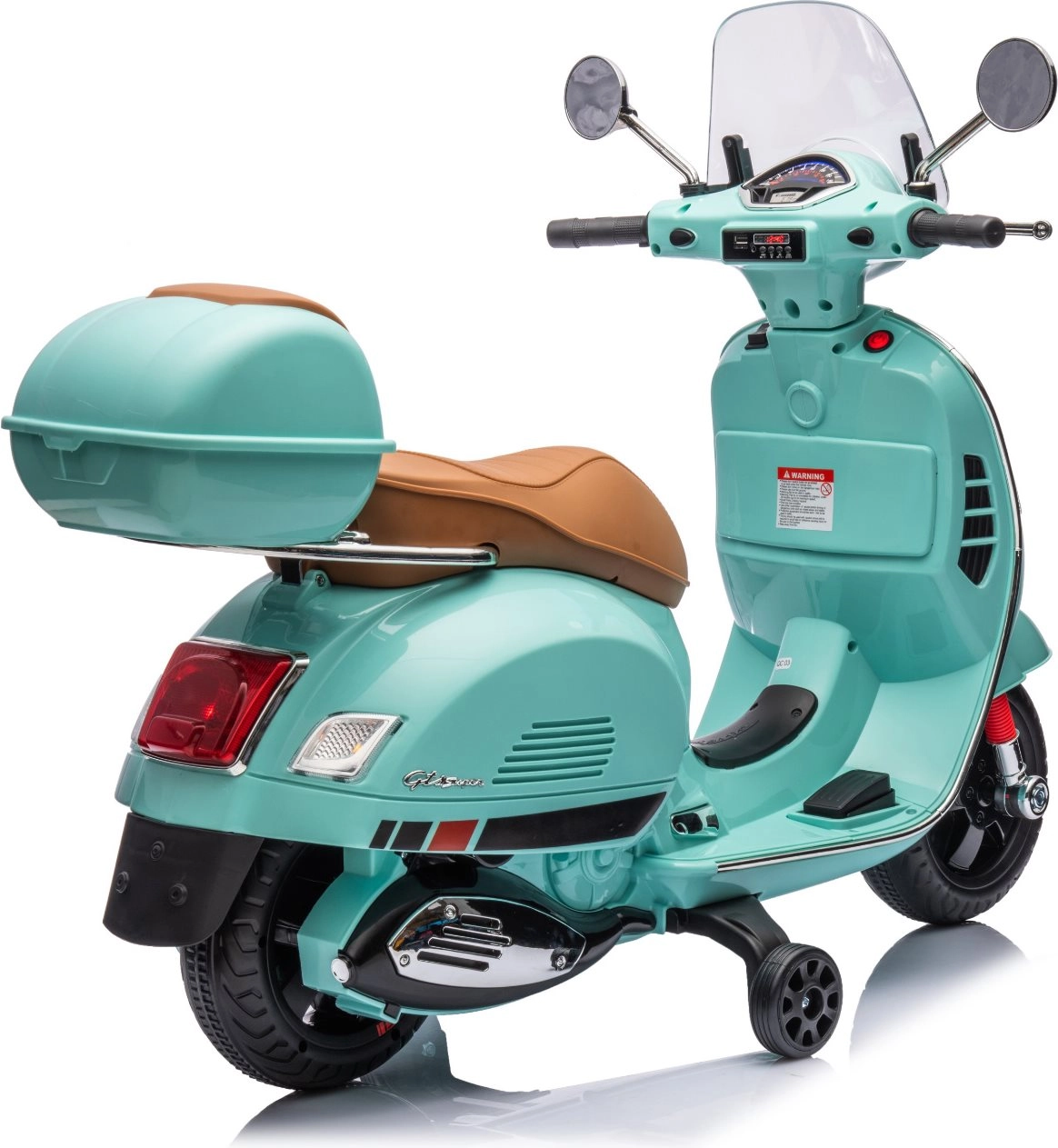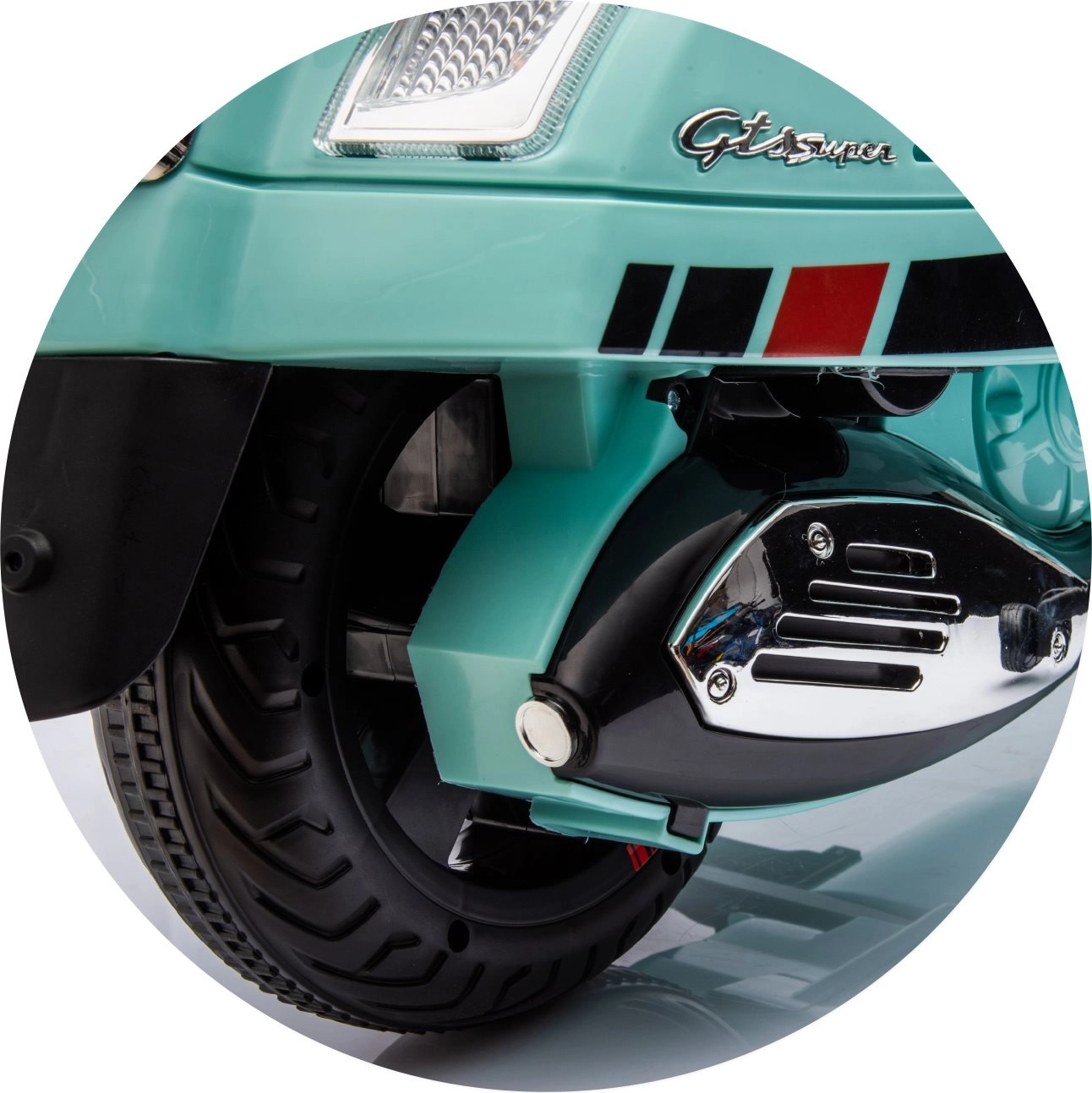 Stiliziran električni otroški motor, navdihnjen z ikonično VESPO GTS, bo malim voznikom všeč zaradi realističnega videza in varne vožnje. Ponuja dva motorja 2 × 30 W, stabilizacijska kolesca, LED luči, udoben sedež iz eko usnja ter glasbeni panel z USB/TF/MP3/AUX. Del paketa sta tudi zadnji shranjevalni box ter svetlobni in zvočni učinki za še več zabave.