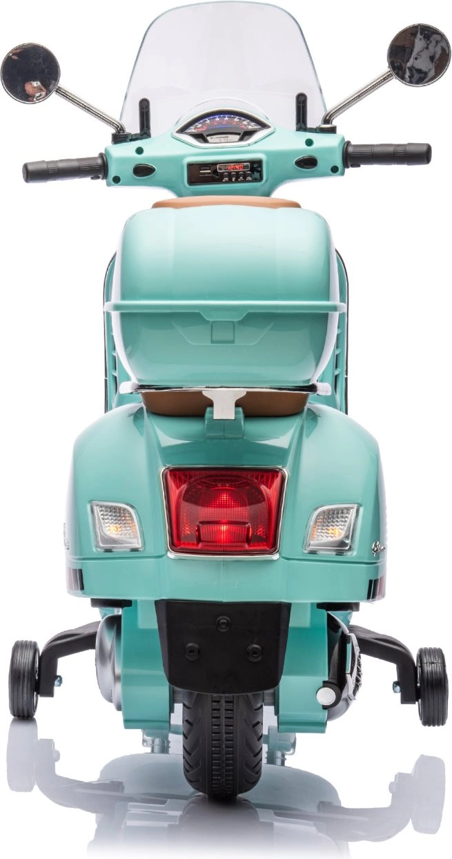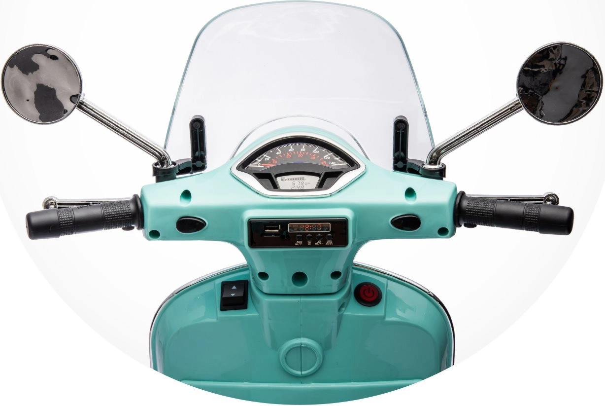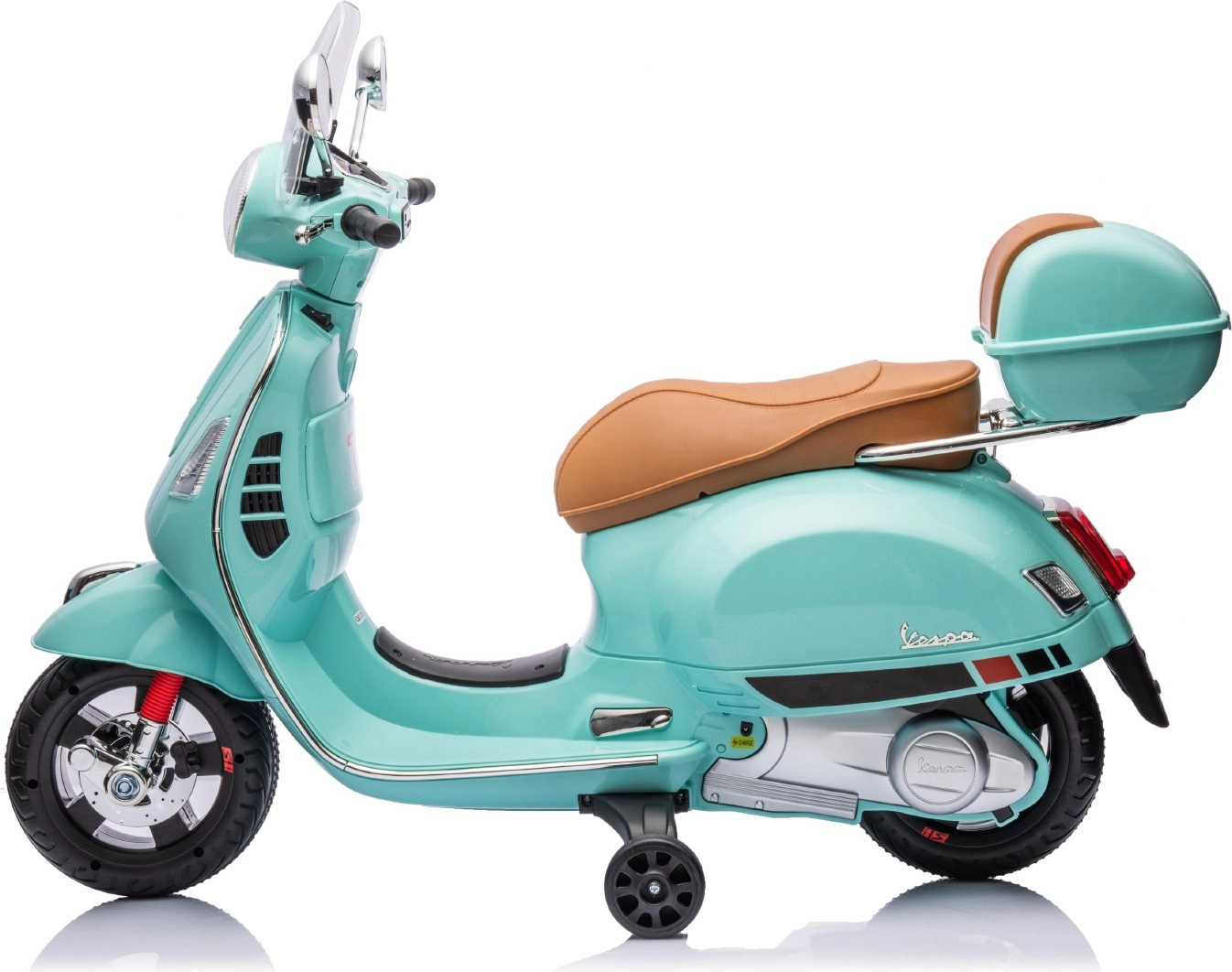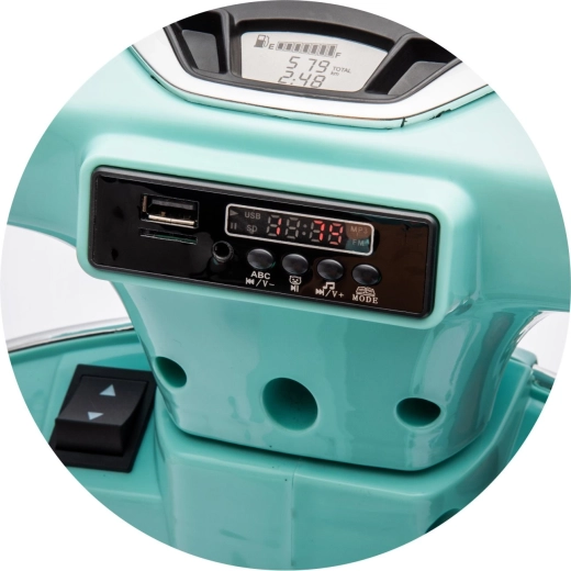 Stiliziran električni otroški motor, navdihnjen z ikonično VESPO GTS, bo malim voznikom všeč zaradi realističnega videza in varne vožnje. Ponuja dva motorja 2 × 30 W, stabilizacijska kolesca, LED luči, udoben sedež iz eko usnja ter glasbeni panel z USB/TF/MP3/AUX. Del paketa sta tudi zadnji shranjevalni box ter svetlobni in zvočni učinki za še več zabave.