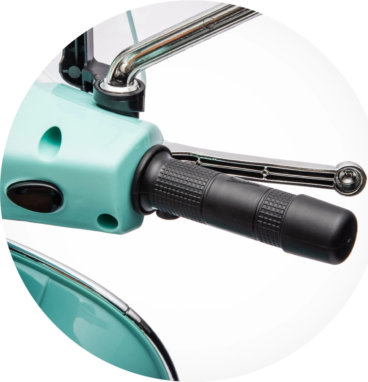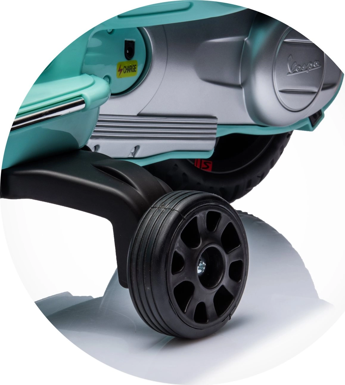 Električni motor v slogu VESPA GTS otrokom prinaša varen in zabaven način razvijanja ravnotežja in motorike. Zahvaljujoč dvojici motorjev (2 × 30 W) speljuje gladko in zanesljivo, medtem ko stabilizacijska kolesca pomagajo ohranjati samozavest v sedlu. Sprednja in zadnja LED osvetlitev povečujeta vidnost in motorju dodajata avtentičen videz.