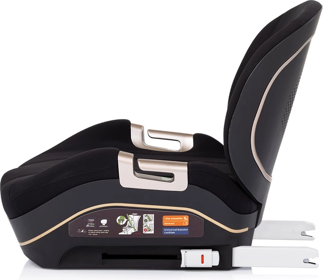Vgrajena vodila pasu pomagajo pravilno voditi varnostni pas in tako zmanjšujejo tveganje nepravilne uporabe. Zeleni varnostni indikatorji ISOFIX vizualno potrdijo pravilno pripetje – klik in pripravljeni ste na pot. Eleganten prevlek z zlatimi/srebrnimi detajli dopolni notranjost vozila, kakovostna izdelava pa olajša prenašanje med vozili brez kompromisov pri varnosti.