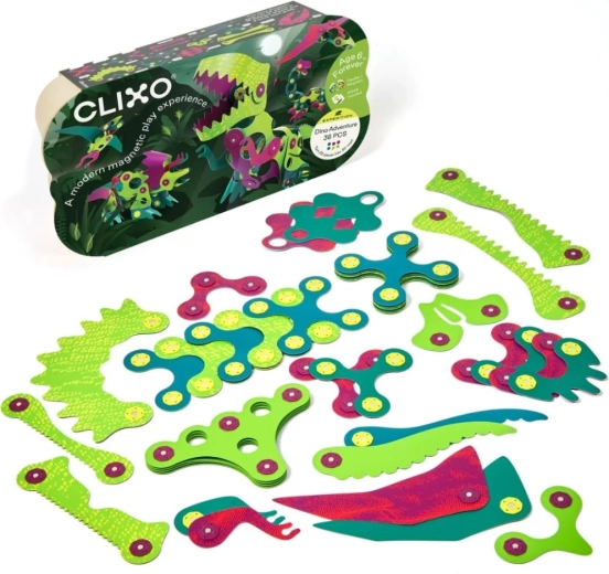 Magnetni set Clixo v motivu DINO spodbuja ustvarjalnost, fino motoriko in prostorsko predstavljivost. Deli se zaradi vgrajenih magnetov zlahka pritrdijo z vseh strani, fleksibilna zasnova pa omogoča ustvarjanje ploskih in 3D modelov – od dinozavrov do izvirnih domišljijskih oblik.