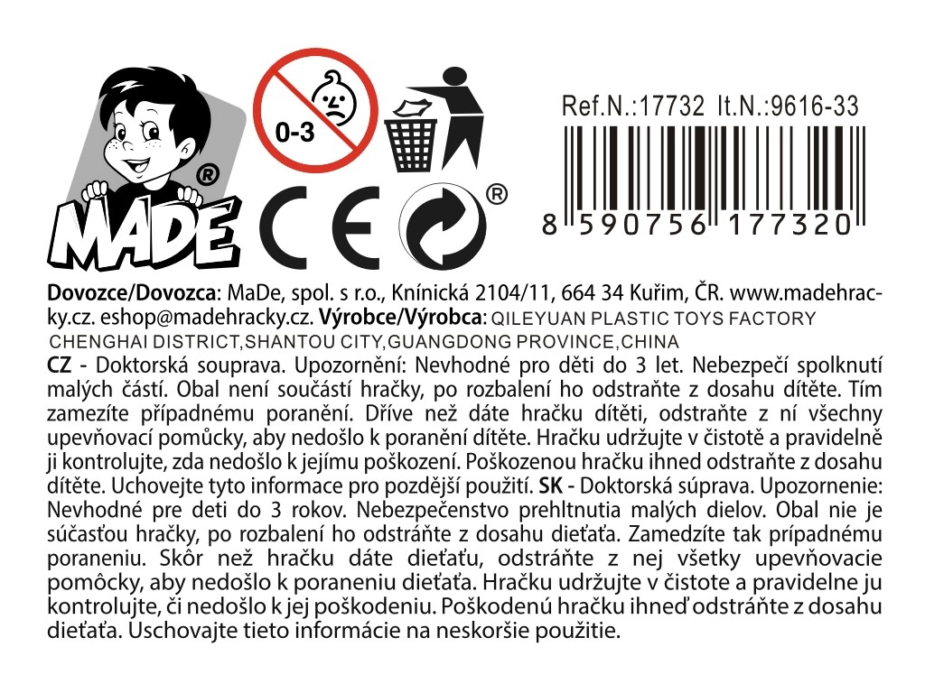 Ta zdravniški komplet za otroke od 3 let spodbuja domišljijo in razvija socialne veščine. Vsebuje 2 vrsti zdravniških pripomočkov, izdelan je iz kakovostne plastike in se zaradi kompaktnih mer 17,5 × 15 × 4 cm zlahka prenaša. Ne potrebuje baterij – zabava se začne takoj po odprtju.