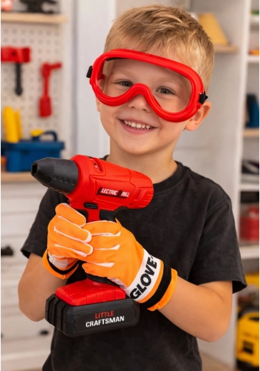 Del paketa so lahka zaščitna očala z nastavljivim trakom in trpežne rokavice. Otroci se učijo osnov varnosti pri delu v delavnici.