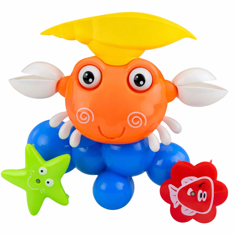 Barvit rak z nasmehom in fontano spremeni kad v morski svet. Le vlijte vodo v zgornjo školjko in kolesca se zavrtijo, elementi se začnejo premikati, iz rakovih ust pa privre nežna fontana. S priseski igračo preprosto pritrdite na gladke ploščice ali kad, kjer med igro zanesljivo drži.