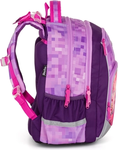 Šolski set Oxy Go Playworld Girl prinaša kombinacijo udobja, vzdržljivosti in igrivega piksel dizajna v rožnato-vijolični izvedbi. Glavna zvezda je lahek in stabilen nahrbtnik z ergonomskim hrbtnim delom, ki odlično pristaja otrokom od približno 125 cm višine. Zaradi več prekatov in notranjih žepov vanj spravite učbenike, zvezke in malico, medtem ko stranska žepa sprejmeta steklenico ali drobnarije.
