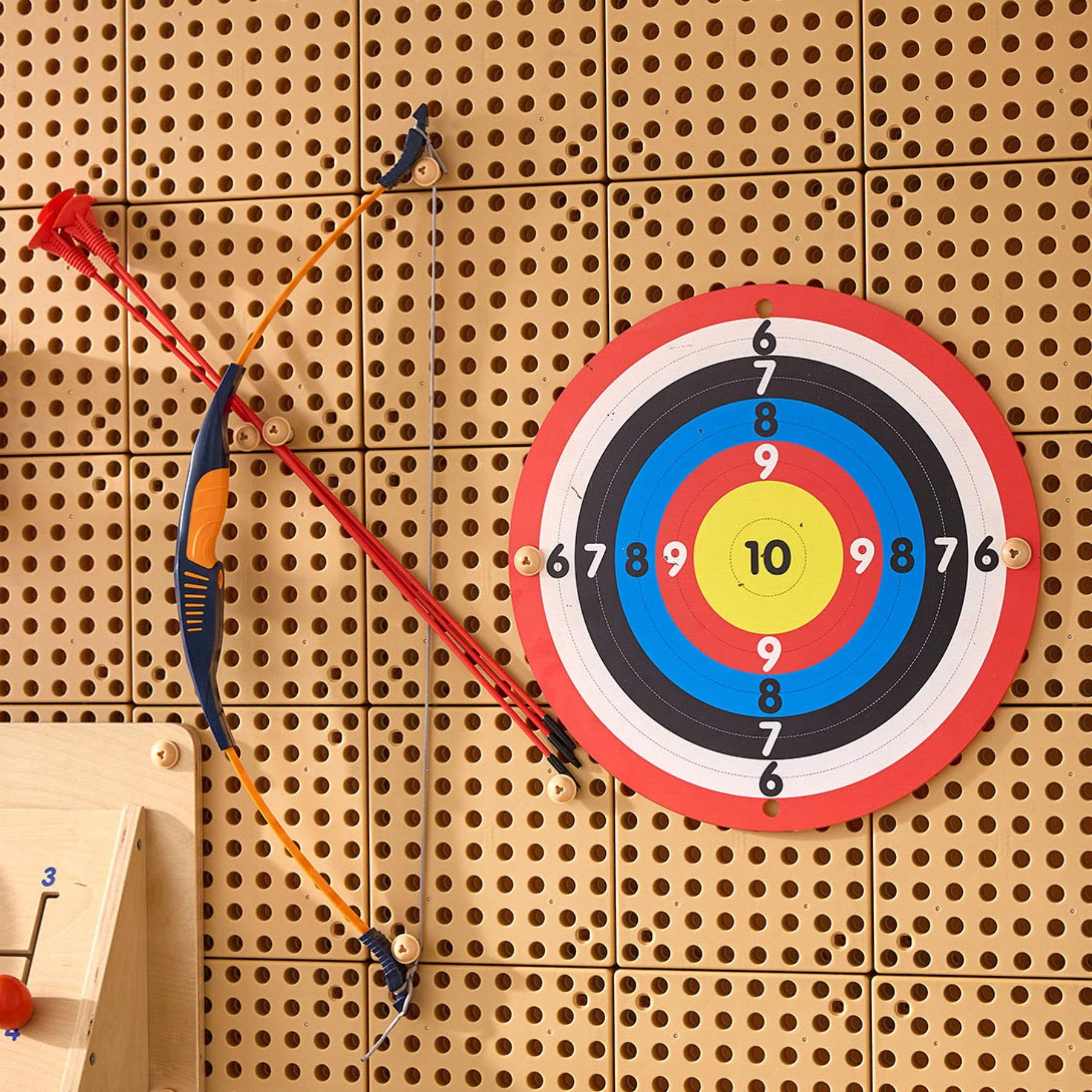 Komplet je v celoti združljiv s STEM tablami in se enostavno pritrdi na perforirane stene, zato hitro ustvarite pametno igralno cono doma ali v vrtcu. Lahek plastičen lok je oblikovan za majhne otroške roke in podpira fino in grobo motoriko, koordinacijo oko–roka ter družbene veščine pri igri v paru ali manjši skupini.
