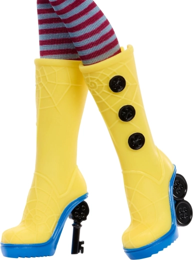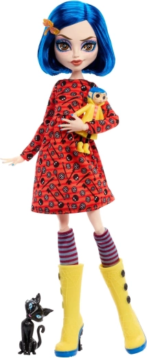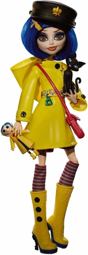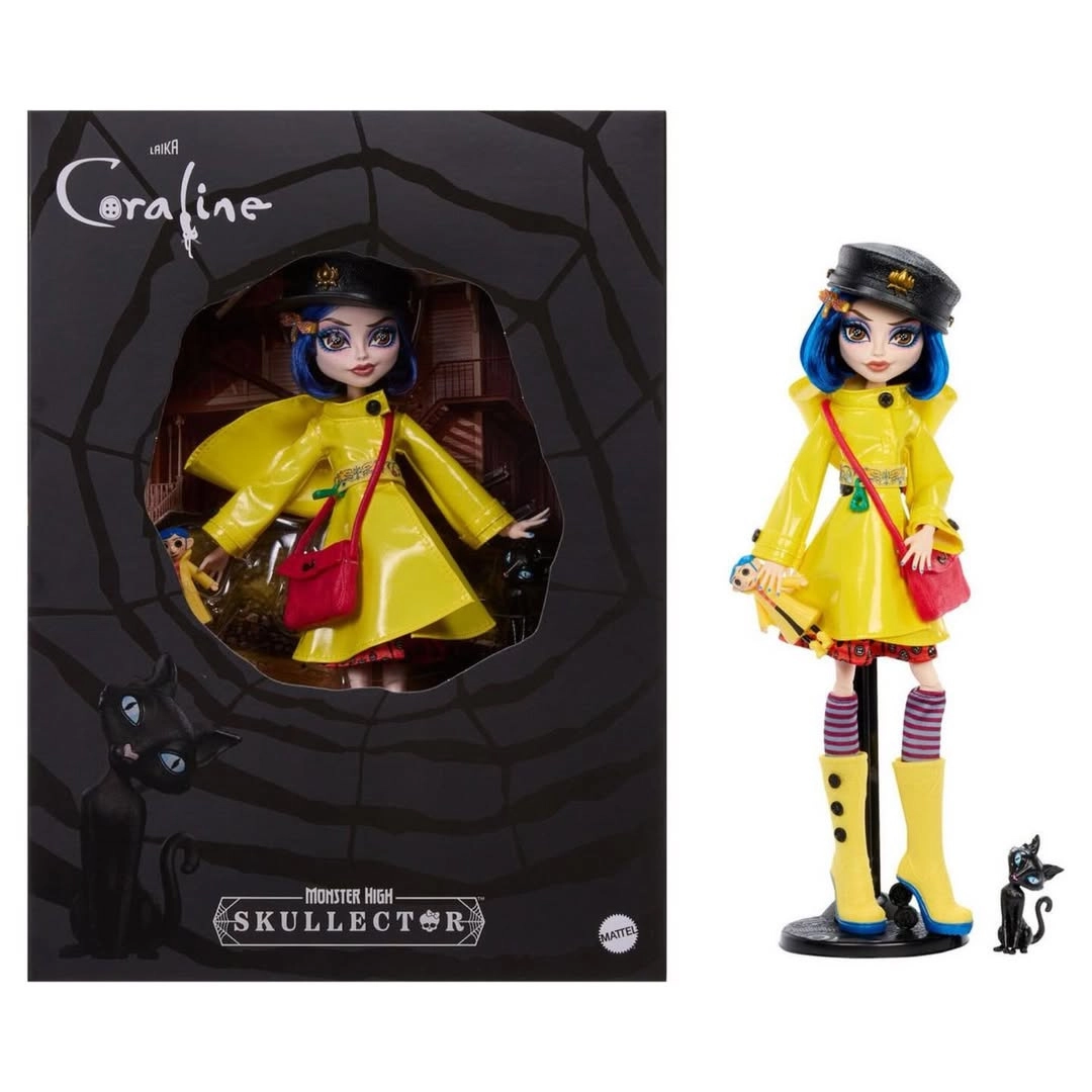 Odkrijte čar temne fantastike s punčko CORALINE v edinstveni interpretaciji Monster High Skullector. Precizno izdelan rumen dežni plašč z gumbi, črtaste nogavice in rumeni visoki čevlji s pajkovimi podrobnostmi zvesto namigujejo na filmsko izvirnico. Priloženi so tudi mini punčka Coraline z gumbi za oči, stilska torbica, klobuk in figurica črnega mačka.