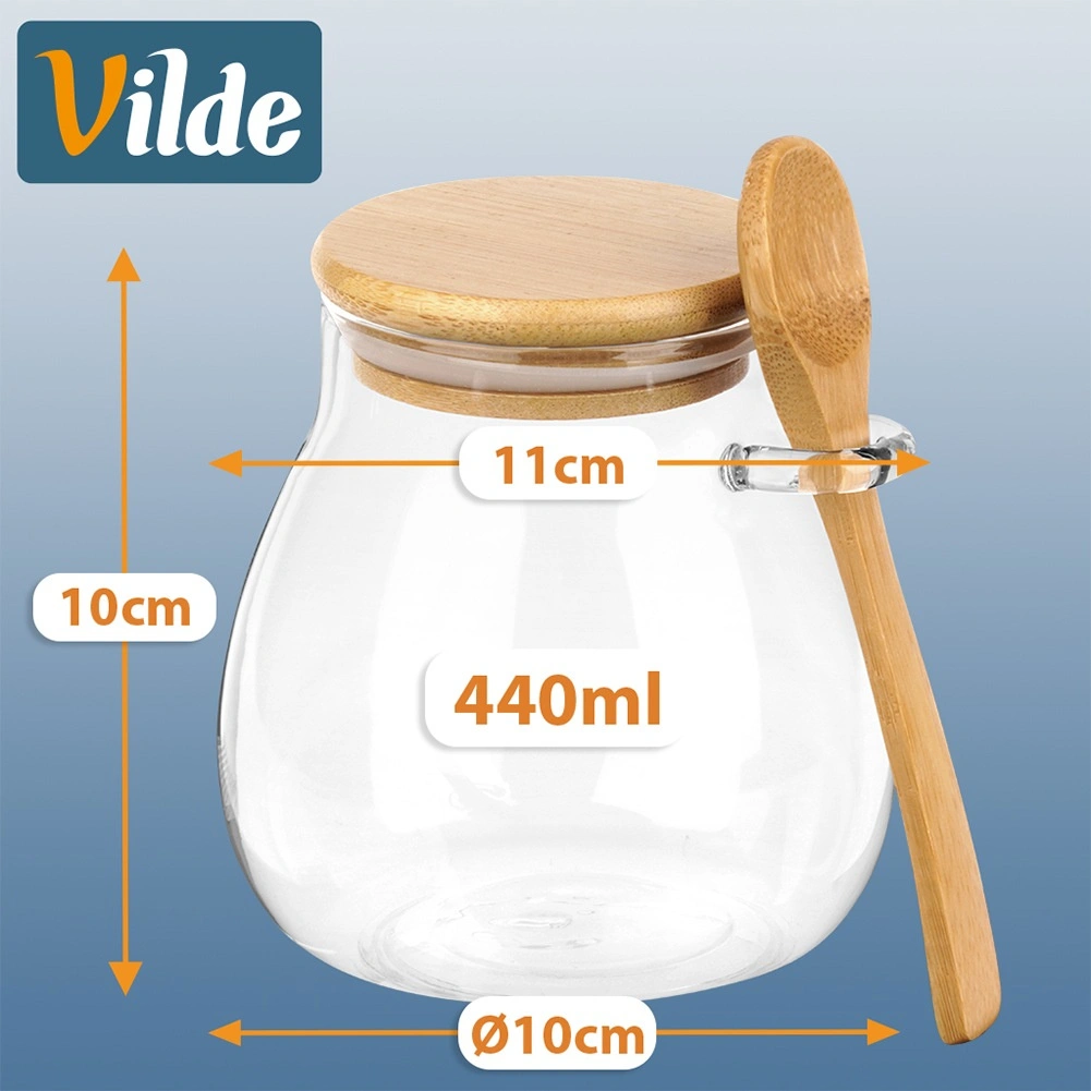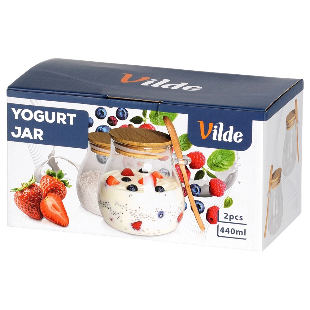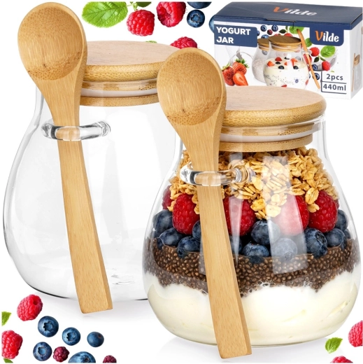 Komplet dveh steklenih kozarčkov s prostornino 440 ml z bambusovim pokrovom in integrirano žličko je idealen za jogurte, sladice, marmelade, med in tudi začimbe. Tesnilni pokrov ohranja vsebino dlje časa svežo, praktično držalo za žličko pa poskrbi, da jo imate vedno pri roki.