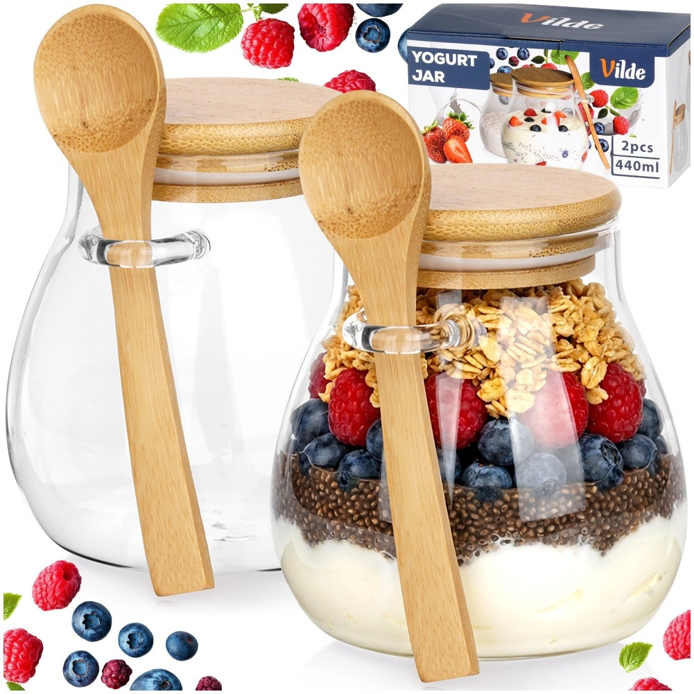 Dva steklena kozarčka 440 ml z bambusovimi pokrovi in žličkami – idealna za serviranje in shranjevanje sladic ter prigrizkov doma ali na poti.