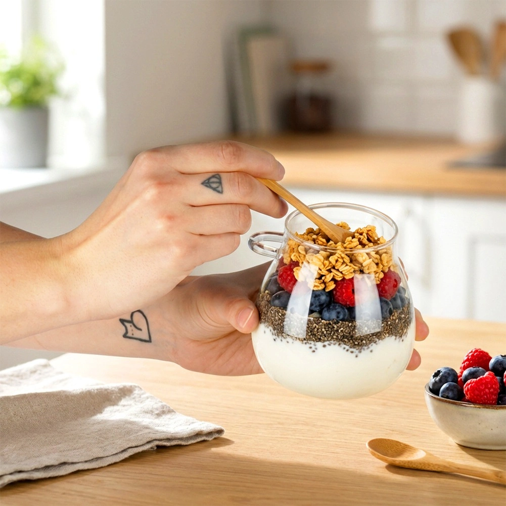 Odkrijte stilske in praktične kozarčke, ki poudarijo vaše domače jogurte, chia pudinge ter plastene sladice. Prosojno steklo lepo prikaže vsebino, medtem ko bambusov pokrov s tesnilom ščiti pred izsuševanjem in vpijanjem vonjav. Integrirano držalo na strani poskrbi, da je žlička vedno pripravljena za serviranje.