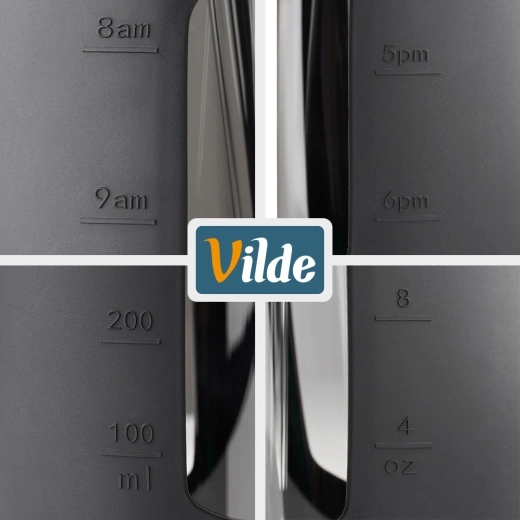 V kompletu prejmete dva praktična pokrovčka: športni flip pokrovček z ustnikom in ročajem za enostavno nošenje ter bambusov pokrovček z odprtino za slamico. Priloženi sta tudi dve večkratni slamici (steklena in nerjaveča s silikonskim nastavkom) ter čistilna ščetka. Merilnik v ml (do 700 ml) in v unčah (4–34 oz) ter dnevne časovne oznake (8–12 in 14–18) vam pomagajo piti redno čez dan.